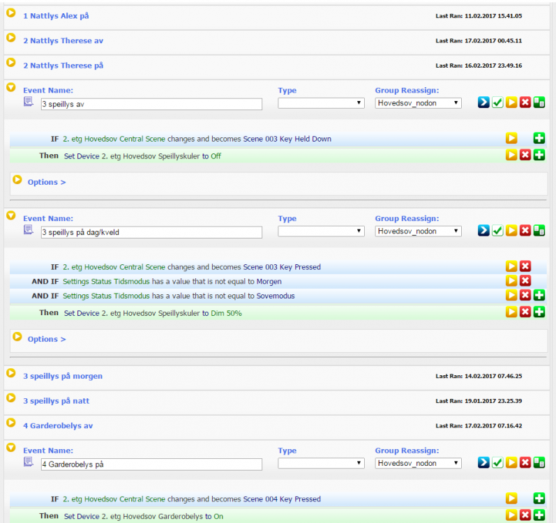 Nå er det mulig å styre en varmekilde med en vilkårlig temperatursensor og en vilkårlig varmekilde (av/på). Jeg har lovet i lengre tid å slippe script-pakken min, men det har vært litt mer utfordrende å lage en fungerende frontend. Nå har jeg imidlertid hoppet bukk over den problemstillingen og har flyttet innstillingene fra selve root-devicen og over i en tradisjonell ini-fil. Det gjør det lettere å endre alle innstillingene, selv om det er et stykke fra å være ideelt. Merk: Script-pakken er testet, men må vurderes som en beta-versjon. Egenskaper: "Auto", automatisk modus: Temperatur hentes ut fra et eller to oppsatte programmer. Programmene kan bruke ferdigdefinerte temperaturer eller egendefinerte. "Manual", manuell temperatur: justeres med nedtrekksboks og knapper for + og -) "High" og "Low" for hurtigvalg av forhåndsdefinerte "Schedule" og "AlternativeSchedule" kan byttes på f.eks. med Fridager.vb-scriptet (eller en vilkårlig annen On/Off virtuell device). Foreløpige begrensninger: Fungerer foreløpig ikke på Zee 1 eller 2. Begrensning i mono gjør at Enums ikke fungerer (visstnok). Jeg kan imidlertid unngå enums med litt omskriving (selv om det er veldig praktisk), så det kommer i en ny versjon. Nedtrekksboksen for manuell temperaturvalg setter ikke "Mode" til "Manual" automatisk (begrensning i scripting, kan ikke, så vidt jeg vet sette opp return CAPI-kall i script). + og - knappene gjør imidlertid dette helt fint. Oppsett 1. Først finn device Ref/IDene til både devicen for temperatursensoren og devicen for av/på bryteren til varmekilden (ovnen?). Device Ref står øverst på "Advanced"-tab'en etter at du har trykket på en device (eller i URLen som dukker opp når du holder musepekeren over linken til devicen). 2. Lag et event som du kaller "Termostat setup" (f.eks), sett trigger til "This Event is manually triggered". Legg til en Action som er "Run a Script", og trykk så på knappen "Edit, og skriv inn "VirtualThermostat.vb" (filnavnet er VELDIG viktig) og trykk OK. 3. Nå kollapser scriptet, så vi utvider det igjen og trykker på det røde flyet : . I scriptboksen (det store blanke feltet med Sub Main.... etc) fjerner du alt og kopierer inn scriptet under: ... og trykk på "Save Script" knappen nederst. HUSK: Trykk på "Save Script" knappen nederst. Gjort det? I "Sub or Function"-boksen skal det stå "Setup". I Parameter skal det stå: HeaterDeviceReference=1139,ExternalTemperatureSensorRef=74 ... der du bytter ut 1139 med dev-ref til av/på-bryteren og 74 med dev-ref til temperatursensoren. Da skal alt se slik ut: 4. Trykk på den blå pilen øverst på eventet for å sette i gang setup-rutinen. Da er vi snart ferdige. 5. Scriptet oppretter et Event (i Event-kategorien "Virtual Thermostat") som kjører scriptet hvert 5. minutt, og det er nesten helt riktig. Vi må bare justere et par ting. Åpne scriptet som ligger under "Virtual Thermostat". Gi det et litt mer beskrivende navn, så er det enklere å finne tilbake. 6. Utvid Run Script action'en, og deaktiver "Only allow a single instance to run at a time" (ellers er det jo bare en termostat som vil fungere) Hvis alt nå er vel, skal det se slik ut: 7. Personlig skrur jeg av logging på slike eventer: 7. ??? 8. Profit! Konfigurasjon I /Config-mappen din har det nå dukket opp en fil som heter "VirtualThermostat_nnn.ini" der nnn er device referansen til root'en (den samme som også navngir eventet over). Den vil se f.eks. slik ut: [Settings] ExternalTemperatureSensorRef=74 TemperatureCorrectionAddition=0 TemperatureCorrectionMultiplier=1 TemperatureOffset=0,3 Log=False HeaterDeviceReference=1139 TemperatureHigh=22 TemperatureLow=19 AlternativeScheduleDeviceReference=0 [Schedule] 6:00=High 8:0=Low 16:00=High 22:00=Low [AlternativeSchedule] 6:00=High 23:00=Low ... der vi kjenner igjen ExternalTemperatureSensorRef og HeaterDeviceReference som de vi satte opp i Setup-rutinen. De andre feltene har følgende forklaring: TemperatureCorrectionAddition=0 er hvor mye som legges til eller trekkes fra den faktiske temperatursensoren. Fint for kalibrering TemperatureCorrectionMultiplier=1 hvor mye temperatursensoren skaleres med fra den faktiske temperatursensoren. Fint for kalibrering. (1 = ingen skalering) TemperatureOffset er hvor langt ned under "Setpoint" temperaturen tillates å bli før varmekilden skrus på. Hvis Setpoint er satt til 22 grader, vil ikke ovnen bli satt på før temperaturen har sunket under 21,7 grader. TemperatureHigh og Low er selvforklarende. AlternativeScheduleDeviceReference er referanse til en enhet som bestemmer om det er "Schedule" eller "AlternativeSchedule" som skal brukes. Schedule og AlternativeSchedule: Her står klokkeslett (i stigende rekkefølge og uten ledende nuller) og tilhørende temperaturer. Med mindre du spesifiserer noe annet, vil kl 0:00 alltid begynne med "Low" temperaturvalg. Så da leser vi Schedule slik: Mellom kl 00 og 06 er det "Low" Mellom kl 6 og 8 er det "High" Mellom 8 og 16 er det "Low" Mellom 16 og 22 er det "High" Og fra 22 og utover er det "Low" Du kan spesifisere din egen temperatur istedenfor "High" og "Low" også, i tilfelle du vil ha en halv grad ekstra om kvelden. Da kan det f.eks. se slik ut: [Schedule] 6:00=High 8:0=Low 16:00=High 20:00=22,5 22:00=Low Pro tip: Du kan også sette opp Eventet til å kjøre på "device change" når temperatursensoren endrer verdi, istedenfor hvert 5. minutt (eller hvor ofte det å passer deg). Da kan det også være lurt å sette opp et par tilleggs-triggere til på bestemte klokkeslett eller andre hendelser, for det er jo ingen garanti at temperaturen endrer seg slik at scriptet trigges. Enjoy!1 poeng