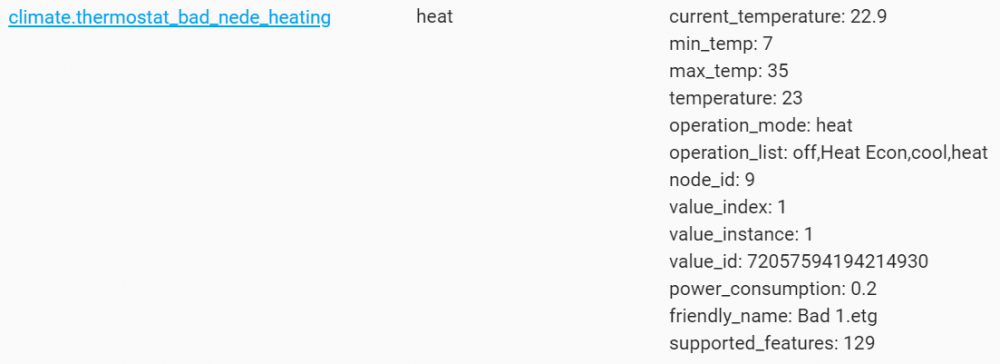 Har også byttet til FX og har samme problemet med at den viser ekstern sensor temp istedenfor gulvtemp, selv om modus er satt riktig. Hvilken temperatur som skal vises kan byttes ved å endre konfigparameter som Neophyte skrev. Har endret på XML config for å få innstillingene til å fungere. De fleste fungerer som de skal nå (har ikke testet alle) Etter endringen fikk jeg også climate entity til å hente riktig verdier. For å fikse Floor sensor og external sensor byttet jeg bare navn i HA. Har fått følgende info fra Heatit: Termostaten har følgende Enpoints EP1 = termostat enhet EP2 = Ekstern føler EP3 = Gulvføler EP4 = Binary switch (RELE og POWERMETERING) Benytter følgende XML config nå: <Node id="9" name="" location="" basic="4" generic="8" specific="6" roletype="5" devicetype="4609" nodetype="0" type="General Thermostat V2" listening="true" frequentListening="false" beaming="true" routing="true" max_baud_rate="40000" version="4" query_stage="Complete"> <Manufacturer id="19b" name="ThermoFloor AS"> <Product type="3" id="202" name="Heatit Thermostat TF 033" /> </Manufacturer> <CommandClasses> <CommandClass id="32" name="COMMAND_CLASS_BASIC" version="1" request_flags="5" mapping="64"> <Instance index="1" endpoint="1" /> </CommandClass> <CommandClass id="37" name="COMMAND_CLASS_SWITCH_BINARY" version="1"> <Instance index="1" endpoint="4" /> <Value type="bool" genre="user" instance="1" index="0" label="Switch" units="" read_only="false" write_only="false" verify_changes="false" poll_intensity="0" min="0" max="0" value="False" /> </CommandClass> <CommandClass id="48" name="COMMAND_CLASS_SENSOR_BINARY" version="5"> <Instance index="1" endpoint="2" /> <Value type="decimal" genre="user" instance="1" index="0" label="External sensor" units="C" read_only="true" write_only="false" verify_changes="false" poll_intensity="0" min="0" max="0" value="False" /> </CommandClass> <CommandClass id="49" name="COMMAND_CLASS_SENSOR_MULTILEVEL" version="5"> <Instance index="1" endpoint="3" /> <Value type="decimal" genre="user" instance="1" index="0" label="Floor sensor" units="C" read_only="true" write_only="false" verify_changes="false" poll_intensity="0" min="0" max="0" value="0.0" /> <Value type="decimal" genre="user" instance="1" index="1" label="Temperature" units="C" read_only="true" write_only="false" verify_changes="false" poll_intensity="0" min="0" max="0" value="23.0" /> </CommandClass> <CommandClass id="50" name="COMMAND_CLASS_METER" version="3" request_flags="3" innif="true"> <Instance index="1" endpoint="4" /> <Value type="decimal" genre="user" instance="1" index="0" label="Energy" units="kWh" read_only="true" write_only="false" verify_changes="false" poll_intensity="0" min="0" max="0" value="40.9" /> <Value type="decimal" genre="user" instance="1" index="8" label="Power" units="W" read_only="true" write_only="false" verify_changes="false" poll_intensity="0" min="0" max="0" value="0.15" /> <Value type="decimal" genre="user" instance="1" index="16" label="Voltage" units="V" read_only="true" write_only="false" verify_changes="false" poll_intensity="0" min="0" max="0" value="232.7" /> <Value type="bool" genre="user" instance="1" index="32" label="Exporting" units="" read_only="true" write_only="false" verify_changes="false" poll_intensity="0" min="0" max="0" value="False" /> </CommandClass> <CommandClass id="64" name="COMMAND_CLASS_THERMOSTAT_MODE" version="1" request_flags="5" innif="true"> <Instance index="1" endpoint="1" /> <Value type="list" genre="user" instance="1" index="0" label="Mode" units="" read_only="false" write_only="false" verify_changes="false" poll_intensity="0" min="0" max="0" vindex="1" size="0"> <Item label="Off" value="0" /> <Item label="Heat" value="1" /> <Item label="Cool" value="2" /> <Item label="Heat Econ" value="11" /> </Value> <SupportedModes> <Mode index="0" label="Off" /> <Mode index="1" label="Heat" /> <Mode index="2" label="Cool" /> <Mode index="11" label="Heat Econ" /> </SupportedModes> </CommandClass> <CommandClass id="67" name="COMMAND_CLASS_THERMOSTAT_SETPOINT" version="1" request_flags="4" innif="true" base="0"> <Instance index="1" endpoint="1" /> <Value type="decimal" genre="user" instance="1" index="1" label="Heating" units="C" read_only="false" write_only="false" verify_changes="false" poll_intensity="0" min="0" max="0" value="23.0" /> <Value type="decimal" genre="user" instance="1" index="2" label="Cooling" units="C" read_only="false" write_only="false" verify_changes="false" poll_intensity="0" min="0" max="0" value="21.5" /> <Value type="decimal" genre="user" instance="1" index="11" label="Heat Econ" units="C" read_only="false" write_only="false" verify_changes="false" poll_intensity="0" min="0" max="0" value="22.0" /> </CommandClass> <CommandClass id="90" name="COMMAND_CLASS_DEVICE_RESET_LOCALLY" version="1" request_flags="5" innif="true"> <Instance index="1" /> </CommandClass> <CommandClass id="94" name="COMMAND_CLASS_ZWAVEPLUS_INFO" version="1" request_flags="5" innif="true"> <Instance index="1" endpoint="1" /> <Instance index="2" endpoint="2" /> <Instance index="3" endpoint="3" /> <Instance index="4" endpoint="4" /> <Value type="byte" genre="system" instance="1" index="0" label="ZWave+ Version" units="" read_only="true" write_only="false" verify_changes="false" poll_intensity="0" min="0" max="255" value="1" /> <Value type="short" genre="system" instance="1" index="1" label="InstallerIcon" units="" read_only="true" write_only="false" verify_changes="false" poll_intensity="0" min="-32768" max="32767" value="4608" /> <Value type="short" genre="system" instance="1" index="2" label="UserIcon" units="" read_only="true" write_only="false" verify_changes="false" poll_intensity="0" min="-32768" max="32767" value="4609" /> <Value type="byte" genre="system" instance="2" index="0" label="ZWave+ Version" units="" read_only="true" write_only="false" verify_changes="false" poll_intensity="0" min="0" max="255" value="0" /> <Value type="short" genre="system