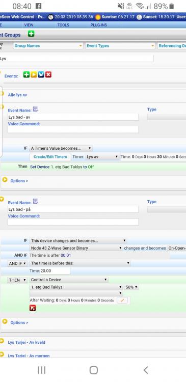 Du kan løse dette med ett event og uten timer. Du kan også droppe «after 00.01» - after/before refererer alltid til midnatt, så det holder med «before 20.00». Dropp første event og bruk event nr 2: Then cancel a delayed device action taklys then set taklys to 50% then set taklys to off after a delay of 30 min Det bør holde.1 poeng