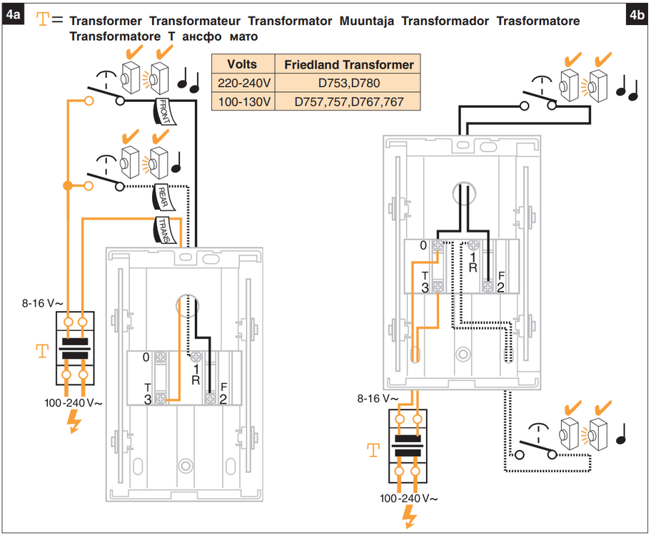 @Svein Erik Jeg er nå i samme situasjon med samme ringeklokke og trafo som du har. Fungerer det fremdeles med den 8V trafoen? Kan du utdype litt hva du mener med "den rett over"? Skal man legge en jumper-kabel mellom det som er markert som "0" og "T3" på 4b-tegningen? Edit: Ser ut til å funke, selv om den ikke lenger lager lyd når jeg trykker på knappen så fungerer video-strømmen 🤔