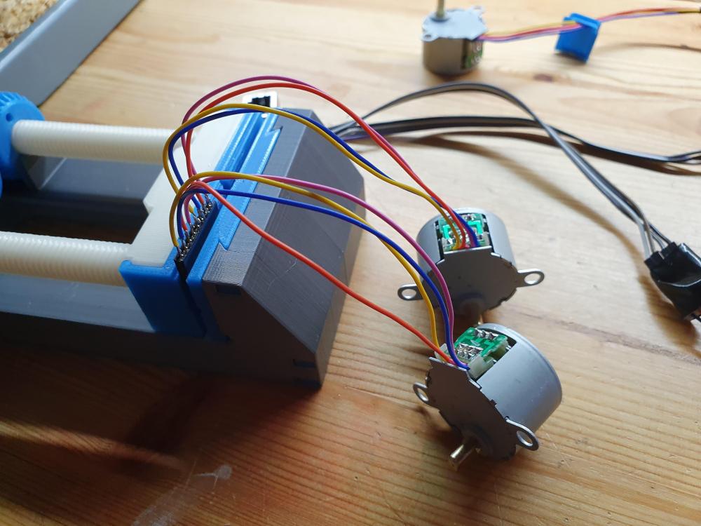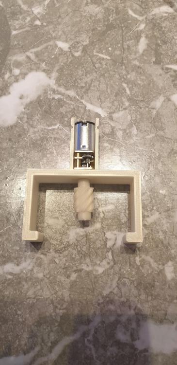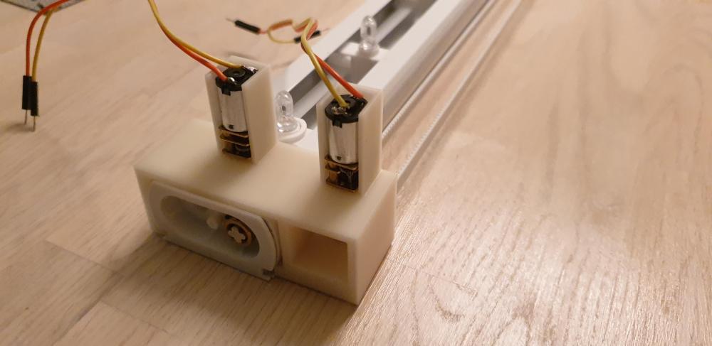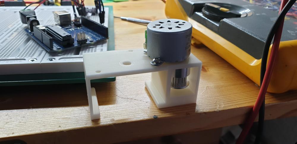 Jeg kom plutselig på at jeg har en steppermotor med navn 28byj-48, 5V-utgaven, fra ett Arduino sett. Etter å ha redesignet festet til å passe å testet den på skinnen viste det seg desverre at den ikke var kraftig nok. Men jeg likte størrelsen og lydnivået. Jeg vet den finnes i 12v utgave også så jeg skal undersøke litt om den er kraftigere eller om det finnes noe tilsvarende.
