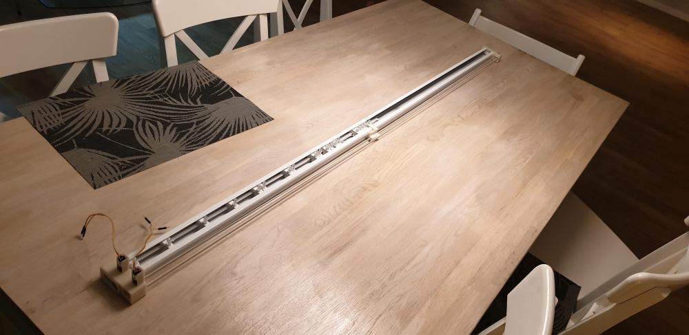 Som sagt før, det går sakte men sikkert fremover. Heldigvis er det ikke overflod av sol i nord Norge. Har løst alle problemene nå og er klar for produksjon. Fant ut i siste liten at siden jeg har 2 vinduer med 2 skinner i hver ville jeg kjøre 2 motorer på hver driver. Da trenger jeg bare 1 strømforsyning, 1 ESP og 4 drivere til 8 motorer. Boksen til all elektronikken blir ganske stor så det er en fordel med minst mulig store bokser på veggen ? Startet å printe de siste delene i natt, men i mårrest oppdaget jeg at printen hadde kræsjet. Og det var første gang det har skjedd