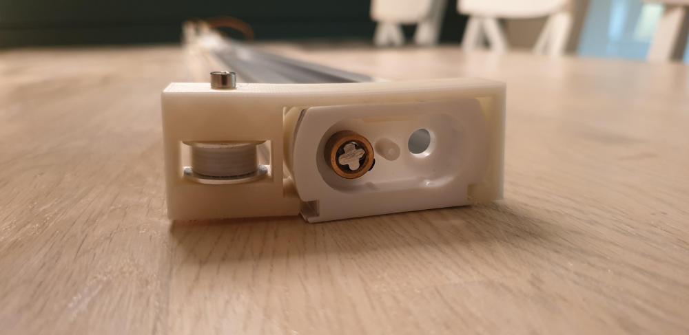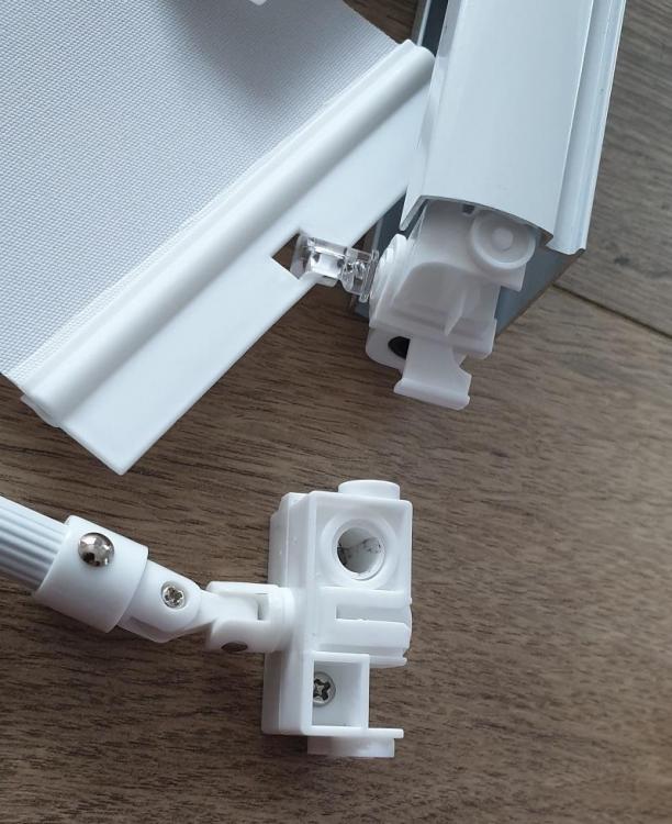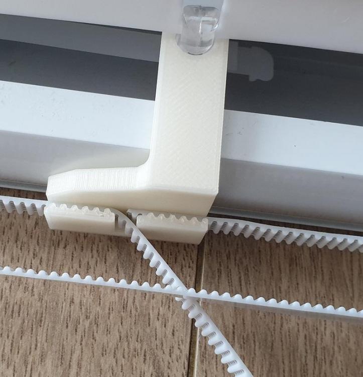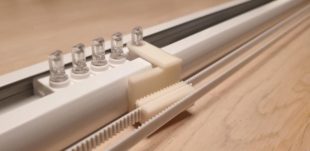 Merk, jeg har ikke fikset elektronikken enda. Det er fordi jeg har 2 vinduer med to skinner i hvert vindu så jeg har ikke bestemt meg for hvordan jeg skal koble det enda. Men systemet er designet for å være modulært å fungere på en skinne alene. Bill of materials (BOM): 2 stk steppermotorer (28BYJ-48, 5v eller 12v) 2 stk motor drivere (DRV8825) 1 stk cnc shield v3 (optional) 1 stk GT2 20T idler pulley 3mm bore (link) 1 stk GT2 20T timer pulley 6mm bore (link) 4 stk M3 3mm skruer 1 stk M3 20mm skrue 1 stk GT2 steel core belt (link) 1 stk relè STL-filene kommer på thingiverse snart hvis ingen vet om en bedre plattform? Fremgangsmåte for montering: Finn fram lamellskinnen: Demonter enden med stangen og få løs delen stangen sitter på (vrimekanismen). Ta av den ytterste lammellen. Ta så av det lille festet som binder vrimekasnimen til den første lamellen (den lille delen med en running og en flat side). Sett på festet for beltet. Sett på lamellen. Sett på ytterkanten igjen Moter det tannhjulet som ikke drives av motoren å sett den på samme side av lamellskinnen som du tok av stagen. Ta av stangen og demonter roteringsmekanismen. Dette er det vanskeligste steget å få til uten å ødelegge noe. Sett inn det modifiserte tannhjulet med hull for motoren. Fest roteringsfestet på motsatt side av lamellskinnen (motsatt side av der du tok det av). Ta også av stoppfestet på stangen. Monter festet for motorene. Monter beltet. Klipp av det som blir til overs med en avbiter. Monter skinnen på plass Sett stoppskiven på plass i nærheten av motoren. Monter "hjernen" en passen de plass.