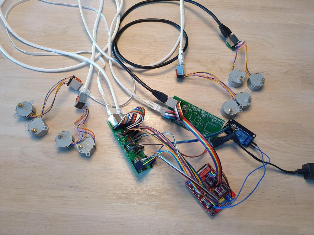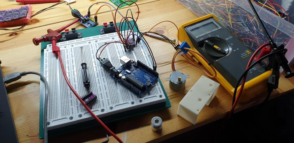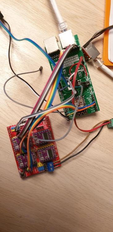 Det går sakte men sikkert fremover. Jeg kjøpte meg et Arduino CNC Shield til stepper-driverne for å slippe å kable mye. I tillegg har jeg lagd ett custom PCP- kort med de funksjoner jeg bruker mest (ethernet som signalkabel etc). Men jeg har minst 2 problemer før jeg er i mål: 1. Jeg klarer ikke å få motorene til å gå rundt med mindre jeg gjør det i en blocking-loop. Dette gir problemer med WDT på ESP8266. I tillegg vil jeg ikke å mulighet til å kjøre flere motorer samtidig. 2. Motorene blir sinnsyk varme. Leser at det er greit at steppermotorer blir "tok hot to touch", men det må da være grenser. Det kan nok løses med å kutte spenningen til CNC Shield når de ikke er i bruk, men som dere ser så har plasten bøyd seg nå mens jeg har testet forskjellige ting.