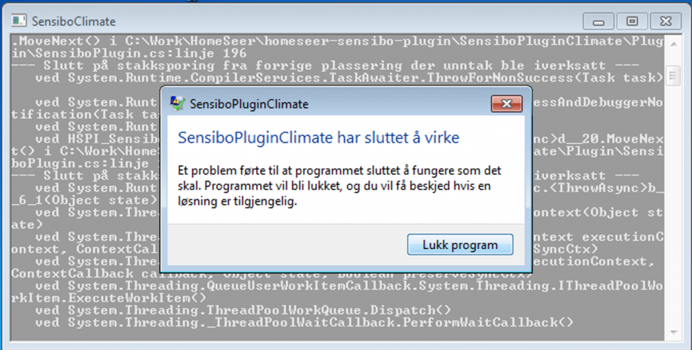 Sliter med å få denne til å funke på HS3 på Win7 maskin. Installerte og startet, alt så fint ut, så la jeg inn API key, men ikke noe skjedde. Ventet et par minutter, men fortsatt ingen devicer. Prøvde deretter å restarte plugin, men jeg stopped den, ville den ikke starte igjen, fikk opp feilmelding: Forsøkte deretter å slette config-fila i config-mappa etter tips her i tråden, men da vil ikke plugin starte lengre, får bare opp "INFO: Plugin start is pending" i plugin manager, mens i loggen så står det: "Finished initializing plug-in SensiboClimate". Etter fem minutter kommer dette i loggen: Initializing plug-in(2): SensiboClimate Instance::Objektreferanse er ikke satt til en objektforekomst.STACK: ved System.Runtime.Remoting.Messaging.LogicalCallContext.PropagateIncomingHeadersToCallContext(IMessage msg) ved System.Runtime.Remoting.Proxies.RealProxy.PrivateInvoke(MessageData& msgData, Int32 type) ved HomeSeerAPI.IPlugInAPI.InitIO(String port) ved Scheduler.clsHSPI.CheckInterfaces() Tips til hva jeg kan prøve for å komme på rett kjør igjen?
