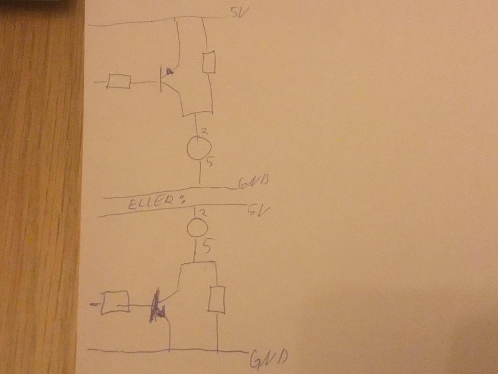 Det jeg skisserte er egentlig to kretser: en for 5volt og en for 1.5volt-ish styrt fra en io. Problemet med denne er nok at begge transistorene kan være på samtidig. Derfor den etterpåanmeldte sorte motstanden. Den kan likegodt koples til 5volt som GND alt etter hva man vil ha som default. Den må helt sikkert være så lav at kun en av transistorene vil lede når ingenting er tilkoplet (arduinoen). CAD-programmet mitt er på en annen maskin akkurat nå, men med to PNP transistorer og to io-pinner så kan man komme unna med bare en motstand foran røret for 1,5 volt om røret er pålitelig 30 ohm. -