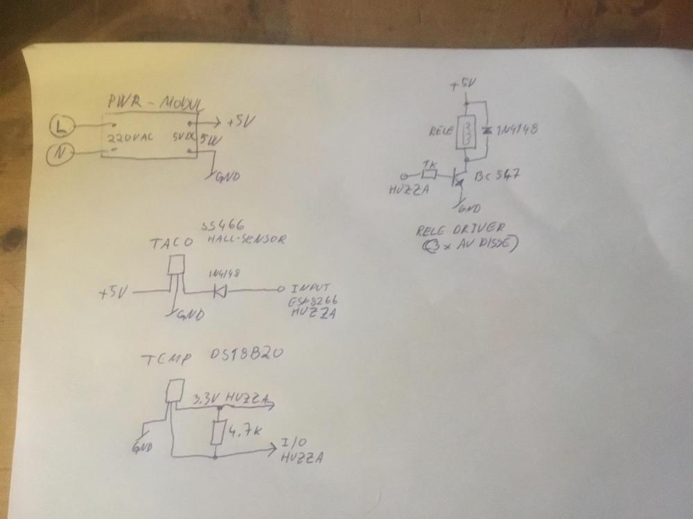 Steike, ESP8266 gjør mye rart på io-pinnene ved oppstart og ved flash! Litt neppå sia er en tabell: (GPIO Behaviour Summary) http://rabbithole.wwwdotorg.org/2017/03/28/esp8266-gpio.html Jeg har med andre ord bare to "rene" io-pinner å bruke for releer om jeg ikke vil at vifta skal begynne å snurre når ESPen bootes, eller enda værre når den flashes. Dette er gpio 4 og 5. Må da putte de to releene for viftehastighet på disse. Releet for dreieretning spiller det da mindre rolle om klikker inn litt så lenge ingen av hastighets-releene er inne. Hall-sensoren må jeg også lese databladet en gang til på. Jeg tegnet inn en diode på sensorens utgang mere som en refleks. Mener sensoren har en åpen-kollektor utgang, så dioden bør nok erstattes med en motstand. Om jeg ikke gjør det vil gpioen (som i praksis da er en output i deler av oppstart/flash) effektivt bli kortsluttet til GND om viftebladene står sånn att sensoren er inne! Temperatursensoren er mindre ømfiendtlig for litt tilfeldige nivåer på io-pinnen, tror jeg.. Må uansett påregne noen rare resultater fra den som skal forkastes. Skulle ha tatt seg ut om vifta begynner å gå mens jeg driver å roter oppi koblingene. Jeg har lite hår igjen på hodet som det er.. -
