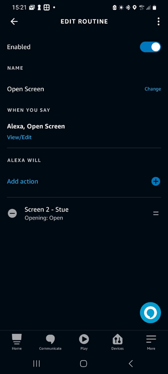 Denne guiden tar utgangspunkt i xComfort Bridge. Jeg har ikke tilgang til Smart Home Controller'en eller Sensio utstyr. Som de fleste vet, er det ikke helt rett frem å kunne styre xComfort enheter fra Home Assistant. Det finnes en veldig bra integrasjon xComfort Integrasjon. men vedlikeoldet av denne har stoppet litt opp og bl.a. så fungerer ikke styringen av xComfort sine aktuatorer for vindu's skjermer (cover.py) fullt ut. Som kjent innførte Eaton full integrasjon mot Alexa og Google Home (delvis) for en tid tilbake. Løsningen min ble derfor å å kommandere Alexa til å styre xComfort enhetene - fra Home Assistant. Jeg startet med å styre vindu's skjermene (Window Screens). Det finnes en custom integration ved navn Alexa Media Player som kan benyttes til dette. Ja, det høres kanskje litt merkelig ut å skulle bruke en Media_player til å fjernstyre solskjermer og lamper, men det fungerer faktisk helt greit. Det finnes en offisiell Alexa integrasjon, men hensikten med den er å eksponere HA entities til Alexa. Det er ikke påkrevd å installere denne for å kunne benytte Alexa Media Player integrasjonen. Det kan være litt kronglete å installere Alexa MediaPlayer integrasjonen. Min anbefaling er å benytte HACS til dette samt å følge dokumentasjonen slavisk. Her blir du anbefalt å aktivere 2-Factor-Authentication (2FA), eller 2-Step-Verification (2SV) som Amazon kaller det. Er du opptatt av sikkerhet, kan det lønne seg, men det gjør førstegangspåloggingen for integrasjonen litt kronglete. Du vil få en feilmelding. Da må du kopiere URL'en og bryte ut i et nytt browser vindu og paste denne inn der og manuelt gå gjennom 2FA påloggingen første gangen. Deretter går det greit. Her er en automasjon som vha en IKEA on/off bryter integrert via deConz/Phoscon som kjører solskjermen opp og ned: alias: Close-Open screen description: "" trigger: - platform: event event_type: deconz_event event_data: device_id: 8d5661146e8a32179bfbb2e2445e364f condition: [] action: - variables: command: "{{ trigger.event.data.event }}" - choose: - conditions: - "{{ command == 1002 }}" sequence: - service: media_player.play_media data: media_content_id: Open Screen media_content_type: routine entity_id: media_player.my_echo_dot - conditions: - "{{ command == 2002 }}" sequence: - service: media_player.play_media data: media_content_id: Close Screen media_content_type: routine entity_id: media_player.my_echo_dot mode: single Dersom du kjører HAOS og benytter ZHA (i steden for deConz) så blir koden slik: alias: Close-Open screen description: "" trigger: - platform: event event_type: zha_event event_data: device_id: 90f50ccf9a8a96682083943d78dc0978 condition: [] action: - variables: command: "{{ trigger.event.data.command }}" - choose: - conditions: - "{{ command == 'on' }}" sequence: - service: media_player.play_media data: media_content_id: Open Screen media_content_type: routine entity_id: media_player.my_echo_dot - conditions: - "{{ command == 'off' }}" sequence: - service: media_player.play_media data: media_content_id: Close Screen media_content_type: routine entity_id: media_player.my_echo_dot mode: single Løsningen krever at du først etablerer (oppretter) 2 nye rutiner i Alexa Appen på din mobiltelefon: Open Screen og Close Screen. Her er en skjerm dump på en av disse - som et eksempel: Rutiner opprettet i Alexa exponeres automatisk gjnnom MediaPlayer integrasjonen. Det er ingen begrensninger på hva du kan styre. Jeg kombinerer dette med HA bl.. på den måten at jeg har en lysmåler integrert i HA (noe som ikke finnes for Alexa) som trigger automasjonen når lyset fra sola passerer 1500 lux. Da går skjermen automatisk ned.