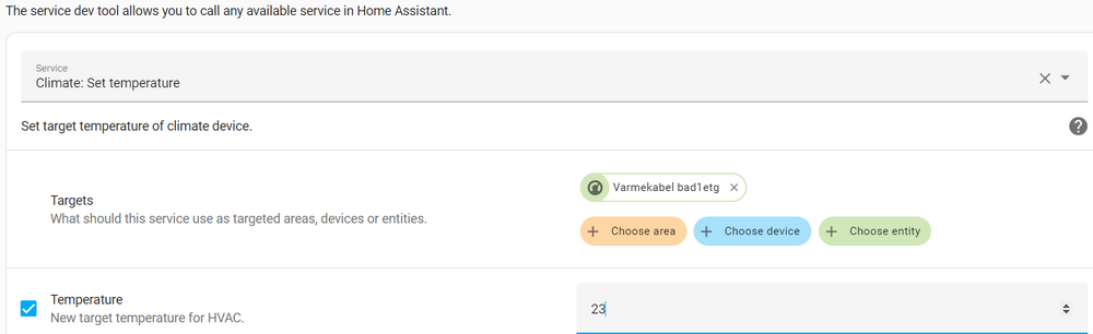 Du må først lage en sensor template for å hente ut temperature attributt (https://www.home-assistant.io/integrations/template/😞 template: - sensor: - name: "Temperature varmekabel bad1etg" unit_of_measurement: "°C" state: > {{state_attr('climate.varmekabel_bad1etg', 'current_temperature') | float}} På grunn av at du bruker unit_of_measurement i template vil du nå få visning i History Graf (https://www.home-assistant.io/dashboards/history-graph/). For å endre på temperature må du bruke SERVICE CLIMATE.SET_TEMPERATURE (https://www.home-assistant.io/integrations/climate/). Vist som yaml: service: climate.set_temperature data: temperature: 23 target: entity_id: climate.varmekabel_bad1etg -