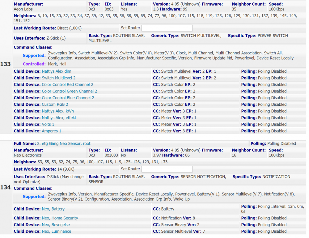 Ikke mulig å se det bildet, kopier heller teksten inn i funksjonen "sitat" eller "kode". Den mest kjente grunnen til at Z-wave på HS3 går sent til tider er dessverre en default løsning hvor alle devicer får tillagt polling med ca. 20 minutters intervall. Dette er helt unødvendig på all moderne z-wave, bortsett fra kanskje batterier. Dessverre en kjedelig jobb, men gå inn på plugin > z-wave > node information, så kan du åpne en og en device med polling og skru det av øverst i z-wave taben. Bør se noe slikt ut når du er ferdig Hvor kjøpte du den fra? Jeg skulle teste den selv, men Intin fortalte meg heldigvis at de ikke fikk til firmware oppdatere den til versjon som HS3 støtter.