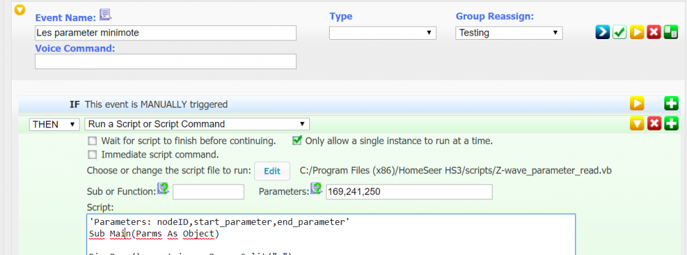 Du kan lese ut ønskede parametre via script.? Sett opp i en event og sjekk loggen etterpå. Parameters: NODE_ID, start parameter, slutt parameter. Eksempel for node 169 leser ut parameter 241 tom 250. 'Parameters: nodeID,start_parameter,end_parameter' Sub Main(Parms As Object) Dim Parm() as string = Parms.Split(",") hs.WriteLog("Z-Wave", "Node No: " & Parm(0)) hs.WriteLog("Z-Wave", "Start Parameter: " & Parm(1)) hs.WriteLog("Z-Wave", "End Parameter: " & Parm(2)) Dim Reply As String = "" Dim HomeID As String = "FYLL_INN_Z-WAVE_HOME_ID" Dim NodeNum As Byte = Parm(0) Dim ParamNum As Byte = 0 For ParamNum = Parm(1) To Parm(2) Reply = "" Reply = hs.PluginFunction("Z-Wave", "", "Configuration_Get", {HomeID, NodeNum, ParamNum}) hs.writelog("Z-Wave", "Node " & NodeNum & ", Parameter " & ParamNum & " is set to " & Reply) hs.WaitSecs(2) Next End Sub