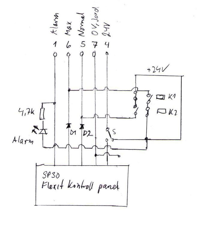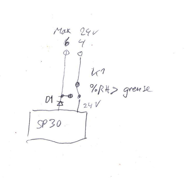 Hei @Frodeb Du kan koble det på samme måte som skjema over viser, men forenklet. Antar vifte skal gå til max ved høy luftfukt. Da trenger du kun å legge "6" til 24V når luftfukt øker over et gitt nivå. Men samtidig må du også bryte 24V til SP30 så ikke viften får to styresignaler samtidig. Det liker den ikke. Hygrostaten din har en vekslekontakt du kan bruke til dette. Dvs, samme kontakt bryter 24V til SP30, og leverer 24V til vifte på Max inngang. Sett også inn en diode, D1 for å hindre at SP30 får 24V inn på Max-inngangen. Ikke så lett å gjøre dette på kortet. lettere å koble seg på kablen mellom vifte og styringsenhet. Håper dette er til hjelp PS. Du må teste dette på eget ansvar...