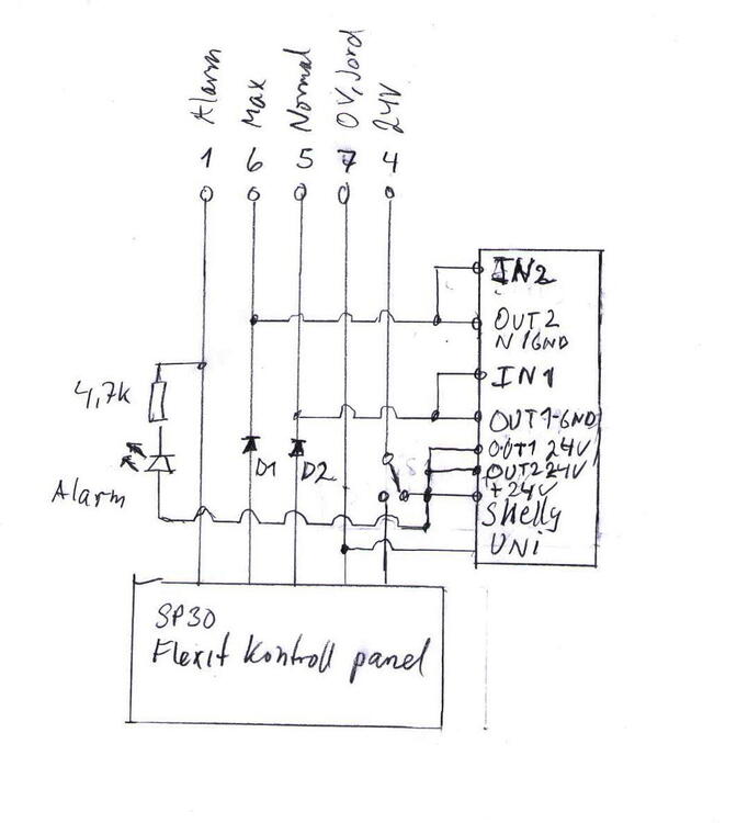 For å styre aggregatet trengs i prinsippet bare to releer, ett for hver hastighet. Men jeg ville gjerne ha en manuell backup løsning, så jeg valgte å koble meg til i serie med styrepanelet SP30, og med en enkel vender for å velge manuell eller auto. Under uttesting fant jeg ut at aggregatet overhode ikke likte at både Max og Normal hastighet vble valgt samtidig. Etter at det skjedde fikk jeg ikke stoppet aggregatet, og ikke endret hastighet. Etter litt av og på med strømmen så kom det heldigvis i gang igjen. Altså bør man ha en sperre som hindrer at både max og normal slår inn samtidig. Det kan gtjøres i software i kontrollprogrammet, Homeseer i mitt tilfelle, men jeg fortrekker en hardware løsning, forrigling som det kalles. Det ideelle er å bruke to releer, hver- med to kontakter, en normalt åpen, og en normalt lukket. Men det hadde jeg ikke plass til i veggboksen min. Shelly Uni har to digitale utganger (tror det er opto-koblet open collector), men også to digitale innganger. Så jeg koblet en digital inngang til en digital utgang for hver av hastighetene. Derved kan jeg i Homeseer sjekke om en utgang er satt før jeg trigger den andre. Skjema: Venderen velger auto/manuell. D1 og D2 er to standard dioder, 1N4004 eller lignende og alarm LED er en erstatnig for den som sitter på SP30 kortet, og som gir alarm i auto modus. Jeg brukte en kort nettverkskabel jeg hadde liggende og koblet meg inn på denne med en avgrening til Shelly Uni.