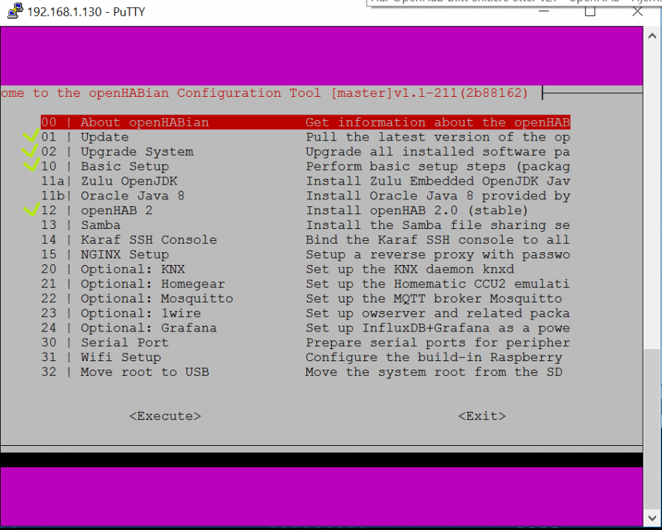 Slik jeg forstår det er det vel ikke værre enn som så: Starting with a fresh installation of your operating system, install git, then clone the openHABian poject and finally execute the openHABian configuration tool. # install git sudo apt-get update sudo apt-get install git # download and link sudo git clone https://github.com/openhab/openhabian.git /opt/openhabian ln -s /opt/openhabian/openhabian-setup.sh /usr/local/bin/openhabian-config # execute sudo openhabian-config