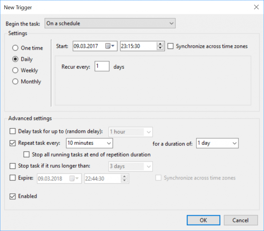 Etter å ha lagt ut noen Powershell Script her, bla for Radnett og Pollenvarsel tenker jeg å lage en guide for å kjøre dem på en hensiktsmessig måte. Windows Task Scheduler, eller bare "Oppgaveplanlegging" som det heter på norsk er en grei funksjon man lenge har hatt i Windows, både på klient og server-siden. Jeg tar i denne guiden utgangspunkt i engelsk Windows 10, men prosedyren er mer eller mindre lik i alle nyere windows-versjoner. Powershell scripts er ikke helt rett frem å kjøre automatisk, det av to grunner. For det første er ikke scriptet i seg selv et program (men et script som skal åpnes i et program, powershell.exe). For det andre er det som standard begrensninger knyttet til Execution Policy (begrensinger ment for å hindre kjøring av ondsinnede script). Det kan så klart settes "unrestricted", men det må gjøres for både x86 og x64 versjonen av Powershell separat og er vel ikke akkurat anbefalt, selv om jeg er veldig glad i å gjøre det selv. Uansett, fremgangsmåte følger: - Start Windows Task Scheduler (kjør taskschd.msc) - Høyreklikk på "Task Scheduler Library" -> "Create Task..." - Nytt vindu spretter opp, her kommer det flere faner, "General", "Triggers,", "Actions", "Conditions" og "Settings". Her fyller du inn følgende: General: Name: Navn på task, f.eks "Test task for kjøring av powershell" Ville også huket av "Run whether user is logget on or not" under "Security options", samt "Run with highest privileges" (Du vet jo hva du kjører) Triggers: Velg "New..." Her er det bare å velge hva man vil, altså når script skal kjøre, f.eks på tid. Det er to ting som er veldig viktig her. For det første dersom start-tiden er satt til før gjeldende dato og tid, da vil denne tasken aldri kjøre. Heller aldri repeteres selv om så er valgt. Det høres litt ulogisk ut, men kan du virkelig repetere noe som ikke er gjort? Nop, og datamaskiner er kverulanter. Den gjør det du sier, ikke det du mener. Nr 2 er så klart å velge "Enabled" i bunnen, dette er dog huket av som standard Klikk så "ok" Actions: Velg "New..." Her kommer triksene for å kjøre et script. Program/script: C:\Windows\System32\WindowsPowerShell\v1.0\powershell.exe <-Link til powershell.exe (funfact, uansett PowerShell versjon så ligger den i v1.0-mappa) Add arguments (optional): -noprofile -executionpolicy bypass -file "C:\powershell_script\test.ps1" <- Link til script i apostrof Start in (optional): C:\powershell_script\ <-sti til script Klikk "Ok" Conditions, Setings og History endrer jeg som utgangspunkt ikke noe i. Klikk "Ok", har du som meg fiklet med "Security options" under general må du nå fylle inn brukernavn og passord for brukerkonto med administrative rettigheter. Jeg satt mitt script til å kjøre hver dag hvert 10 minutt fra og med kl 23:15 den 09.03.2017. For å sjekket dette for testens skyld har jeg satt scriptet til å skrive en logg-fil under kjøring. Get-Date >> "c:\powershell_script\testlogg.txt" Funket som en drøm dette