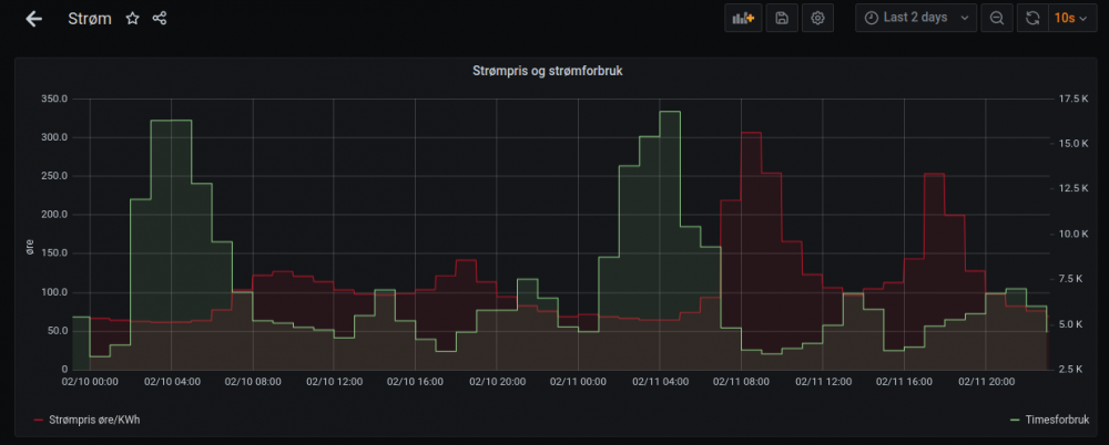 Mange kvelder har gått med til å lage ny styring av husets varmekabler, resultatet kaster endelig av seg med vestlandets store variasjoner i strømpris: Jeg har funnet en typisk strømprofil for norske forbrukere og regnet ut hva min strømkostnad er versus denne, og besparelsen for de to døgnene som vises i plottet er 15 kr og 40 kr. Styringen jeg har for varmekabler er omtrent samme kode som for varmtvannstanken, en Dijstra shortest-path gjennom tid-termostattemperatur-rommet, og der koden gjør approksimasjonen at temperaturen går opp eller ned med fast rate pr. time (tilpasset pr. gulv fra målte data)- 16 svar