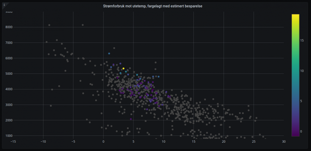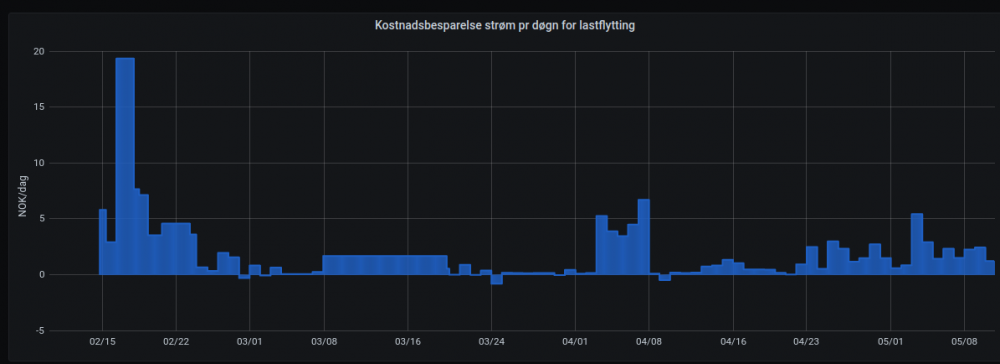 Noen måneder har gått med denne algoritmen kjørende, så det er på tide å analysere litt. Første plott her viser hva jeg estimerer til å være kostnadsbesparelse pr. døgn på grunn av lastflytting. Estimatet er laget ved å anta at totalforbruk gjennom døgnet hadde vært det samme, men hvis forbruket hadde fulgt en gjennomsnittlig døgnprofil for norske forbrukere. Gjennomsnittet av dagsbeløpet i disse 3 mnd er 1.8 NOK, som innebærer 1-2% av strømregningen. Variasjon i daglig sparebeløp kommer av akkurat hvordan prisprofilen er de relevante dagene, og når på døgnet lavpunktet kommer. Den viktige antakelsen for besparelsen estimert over er at jeg ikke bruker mer strøm enn ellers. Dette er uansett en sannhet med modifikasjoner, for fyring av varmekabler når man ellers kunne nattsenket vil nødvendigvis gjøre at huset risikerer å holde en høyere gjennomsnittstemperatur enn ellers, som medfører mer varmetap. Dette er ikke til å unngå, så spørsmålet er om lastflyttingen sparer så mange kroner at denne effekten overskygges. Varmtvannstank er inkludert i besparelsen over, og der gjelder ikke denne effekten like mye. Enn så lenge, så er det heller ingen elbil-lading inkludert. Jeg bruker et scatter-plott for døgnforbruk mot utetemperatur for å avgjøre dette. Her er alle grå punktene data for de siste 2 år, og punkter med farge er de hvor algoritmen har vært aktiv, og fargeskalaen er den estimerte besparelsen (samme tall som i plottet over): Antakelsen om at strømforbruket ikke endrer seg ville stemt hvis alle de fargene punktene lå "midt" i den gråe skya. Dette ser bare ut til å stemme for de dagene der besparelsen er opp til 3-4 kr (som forsåvidt er en helt grei besparelse!). Når besparelsen er oppi 10 kr og over, så ser det ut som om algoritmen blir for aggressiv, og gjør at huset er litt for varmt, kanskje 500-1000W for mye forbruk, noe som forsåvidt er tilsvarende besparelsen de aktuelle dagene i kroner og øre. For enkelhets skyld og med litt godvilje, vil jeg da påstå at oppnåelig besparelse for meg tilsvarer 1% av strømregningen. Jeg skal si meg fornøyd nok med det og kommer ikke til å skru av algoritmen. Jeg trenger ikke lenger se strømprisprofilen på en skjerm, jeg tråkker bare inn på baderomsgolvet, er det varmt, så vet jeg at strømmen akkurat har vært billig og snart er dyr- 16 svar