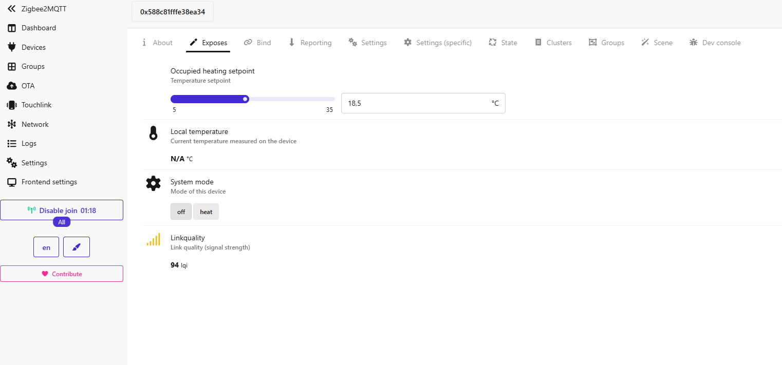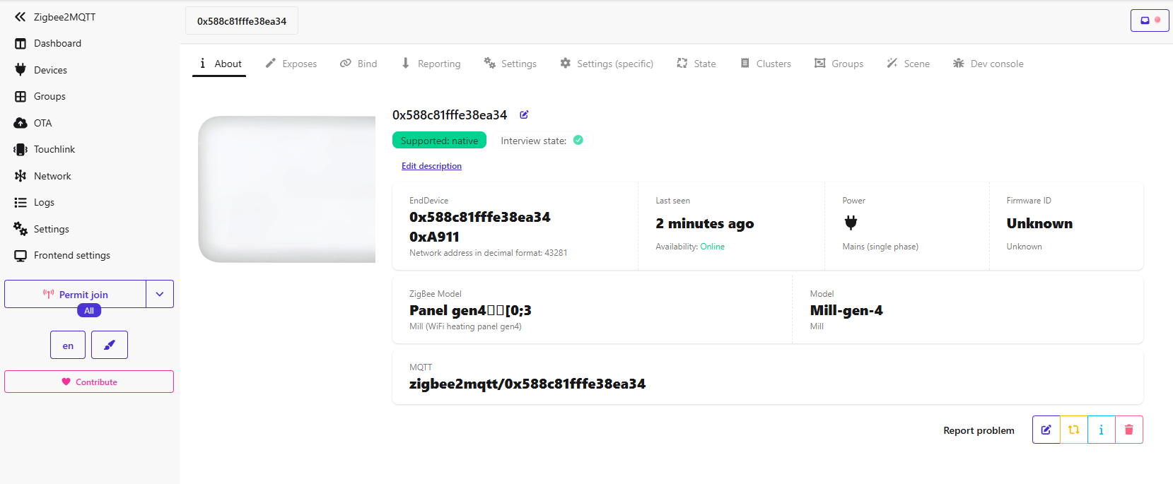 22. Da kom endelig siste versjon av Z2M med støtte for Mill Gen4. Ser ut som "on-off" og set-temp er det som kan stilles på/ses. Håper mer kommer etterhvert. EDIT: Mill sier flere parameterne for ZigBee kommer "en gang i fremtiden". Effektmåling, temp osv. EDIT2: Ser den falt ut i natt rett før 03, mulig stabilites-issues? Offline siden. Ser også at den er registrert som EndDevice fremfor Ruter, noe den ikke burde være.