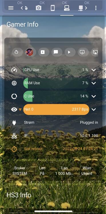 gullfrode Skrevet 24. august 2022 Skrevet 24. august 2022 Bruker iOTlink til oversikt over Windowspc’ene hjemme, har også mulighet for overvåkning av åpne apper og restart, skru av skjerm mv. Dette er MQTT og fungerer med autodiscovery mot Home Assistant(men kan selvfølgelig implementeres i andre system via MQTT). Se nederst i tråden her for en kar som har litt automatikk ut i fra hvilke kjørende spill mv. 3 Siter