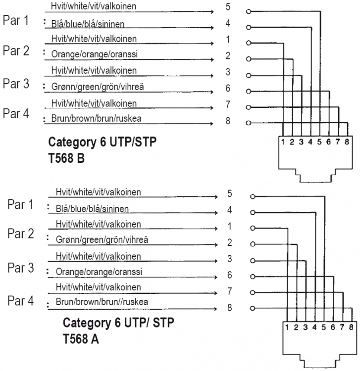 Byelektrikeren Skrevet 27. august 2020 Skrevet 27. august 2020 (endret) T-568B â Brukes i Europa og anbefales brukt av dere som gjĂžr dette selv. Brukt i de fleste ferdige CAT 5-kabler, samt brukes ogsĂ„ i CAT 6 kabling..  Det finnes egne regler for kabling i bolig ref. NEK 700, og elektriker som installerer datakabel i bolig mĂ„ ha egen godkjenning som heter ENA og godkjenning av Nasjonal kommunikasjonsmyndighet. Her er en liste over alle autoriserte firma: Link> Men husk:"Det kreves ikke autorisasjon for installasjon av ekomnett nĂ„r alt installasjonsmateriell og utstyr som inngĂ„r i nettet er spesielt fremstilt for Ă„ kunne installeres av personer uten sĂŠrskilt faglig kompetanse." /Helge Endret 27. august 2020 av Byelektrikeren Siter