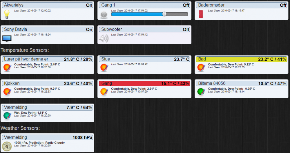 2. Hei Her kommer system ala Hr Kotelett. Det er i både start, prøve og utviklingsfasen, så førsteposten kommer nok til å bli oppdatert Foreløpig er det mest temperaturmåling (bare for å komme igang) jeg har, men med noen Nexa og Fibaroprodukter er lysstyring og begynt såvidt å komme. Bruker Domoticz som kjøres på en Raspberry Pi2 med wifi dongle. På denne har jeg en UZB1 for Z-wave produkter, og en RFLink Gateway for 433 mhz produkter, skal kunne oppgraderes til å kunne brukes med 2,4 ghz produkter, men har ikke lagt så mye energi på å prøve dette/finne ut mer. fint plassert i et nøkkelskap fra Biltema ^^ Temperatur sensorer: 2 forskjellige Biltema sensorer (5 totalt) Clas Ohlson sin til 99,- og Fibaro sin multisensor. Disse brukes foreløpig til bare å vise temperaturer, har ikke kjørt i gang noe sekvenser for over og under visse temperaturer. Artige her er at jeg måtte kjøre opp igjen systemet på nytt igjen etter en krasj (systemet lå brakk 1 måned eller 2), så nå har jeg en biltema sensor et eller annet sted innenfor rekkevidde som oppdaterer temp og fuktighet gjevnlig, men har ingen anelse om hvor den er fysisk. Lys: Fibaro Dimmer 2 FGD212 - Automatisk slår seg på 0630, og av igjen kl 0900, samt 1600 og 2330, kan og styres via Domoticz og Wallc-2 lysbryter. Skal nok bli aktivert av motionsensor med tiden. Akvarielyset er tilkoblet en Nexa bryter som slår seg på kl 12.00 og av kl 2100, i helgene blir dette overstyrt manuelt når vi spiser frokost (det er på kjøkkenet) Dørsensor: Foreløpig kun på badet, som skal trigge en Nexa bryter som slår på et lys med utgangsdøren, sånn at vi kan bli minnet på at døren er åpen og at da bikkjen skal bli forhindret i å gjøre kål på bleiebøtten f.eks. Problemet her er følsomheten, den viser lukket selvom døren bare er inntil, så hunden kan fortsatt dytte opp døren. Dashboard per dags dato, la til værmelding igår, men vet ikke om jeg skal fortsette å ha det. Trenger ikke akkurat barometer i det daglige. Gang termometeret tror jeg sliter litt med rekkevidden. Og hadde vært ålreit å fått byttet tekst på baderomsdøren til åpen og lukket.