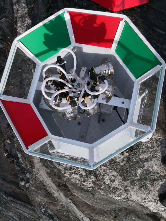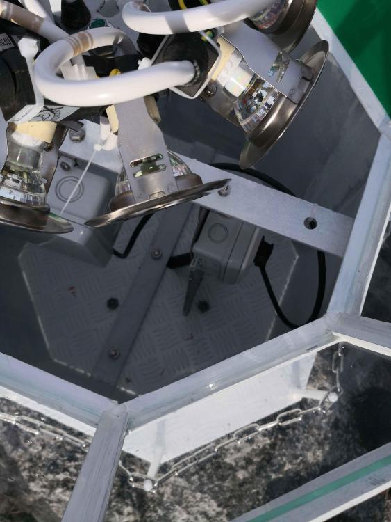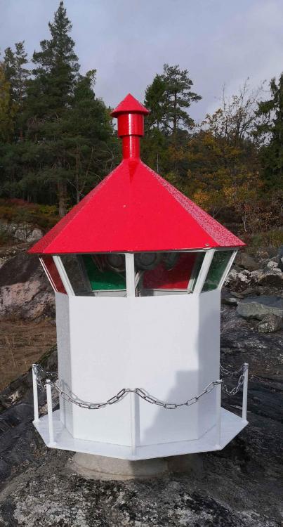 Er ikke i mangel på prosjekter, men ... for å være forberedt på høyvann ved hytta: Anskaffet en fyrlykt fra en kar som lager slike på Ågotnes. Den er 100cm høy, utført i 3mm aliminium, svesiet pent, skikkelig og solid utført. Består av 3 deler, bunn, kropp og tak. Kostet kr 6000,- + ca 1000 for frakt. Den ble levert med holder for én E27 pære, men har modifisert til 6 stk (max 8 dimbare led, 5,5w, GU10. (Den er 8-kantet, men har ikke montert lys mot baksiden.) Som det framgår av bilde finnes en 12mm bolt i midten, slik at lysene kan justeres opp/ned. For tilførsel, kabel ca 25m, 2,5mm2. Kablen går til kontakt inne i lykta, og selve lysholderen er utstyrt med støpsel. Inspisert av 2 elektrikere. Den ene mente lykta skulle blinke.... (Ikke så populært blant naboene, så det ble fast lys) Pga GU10 soklene er det Ikke IP65 eller 54, men den er tett nok, og elektriker sier dette er å betrakte som innendørs og da er det ok. Kurs er med jordfeilbryter. Dimmes med en Fibaro dimmer 2, montert ved hytta. Lys på ved solnedgang, dimmer til 60% trekker da ca 17watt Dimmer ned 10% hver time fram kl 23:30, da dimmes til 2% (for natta) og trekker ca 0,7watt. (Ifølge Fibaro)1 poeng