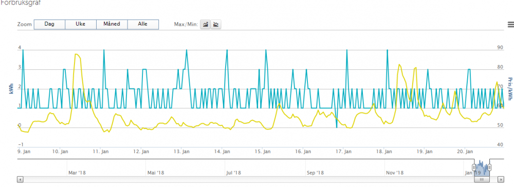 Jeg har gått for veldig enkel styring av strømforbruket.. VV tank har tidsur Varmekabler på tidsstyring/dagsenking Varmepume går av en periode på dagen Resultatet blir dette.. Gul= pris 50-90øre Komfort akkurat lik som før da alt bare sto på og styrte seg selv.. Pris på utstyr 300kr. Har lite forbruk så sparer ikke noe særlig men gøy å få resultater.. Liten enebolig1 poeng
