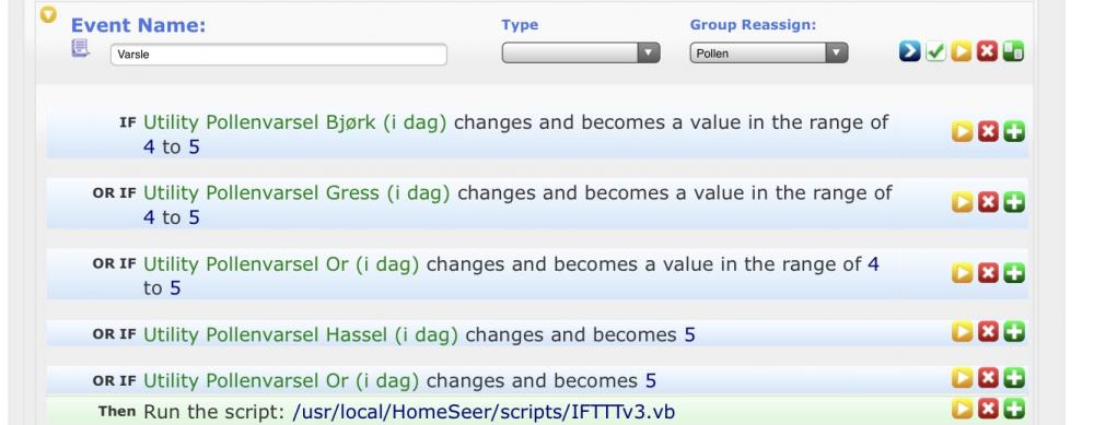 Oppdatert 30.04.19 med nytt "scrape-oppsett". Oppdatert 17.03.21 med ny info om URL. Ble inspirert av @Evelensin løsning for Domoticz (https://www.hjemmeautomasjon.no/forums/topic/1353-pollenvarsel-et-powershell-script/) og gjorde tilsvarende med "Jon00 Data Scraper"-plugin: I "path" trenger du riktig URL til ditt område på begge "grabs" (må ha 2 "grabs" pga maks 5 pattern pr grab): 1. Med Chrome, gå til https://pollenkontroll.no/pollenvarsel 2. Trykk F12 og velg "Network" 3. Finn den adressen som hentes og som består av en del tall og bokstaver (f.eks https://pollenkontroll.no/api/middleware/pollen/901f3d22-b95f-4b64-a181-0b847b76b1a3?t=1615988025432) 4. Fjern "?t=xxxxxx" i URL og bruk den adressen som "Path" i ini-filen Etter å ha kjørt "scrape" en gang, slik at devicene har blitt opprettet, er det bare å opprette en range 0-5 på statusgraphics og så vil man få verdier fra 0-5 som man kan bruke i events. I forrige versjon var det et generelt varsel i tillegg, men det ser ikke ut til å finnes i kilden som brukes nå (pr 30.04.19)... Da kan du sende det generelle varslet, hvis det er varslet stor spredning av en eller flere sorter:1 poeng