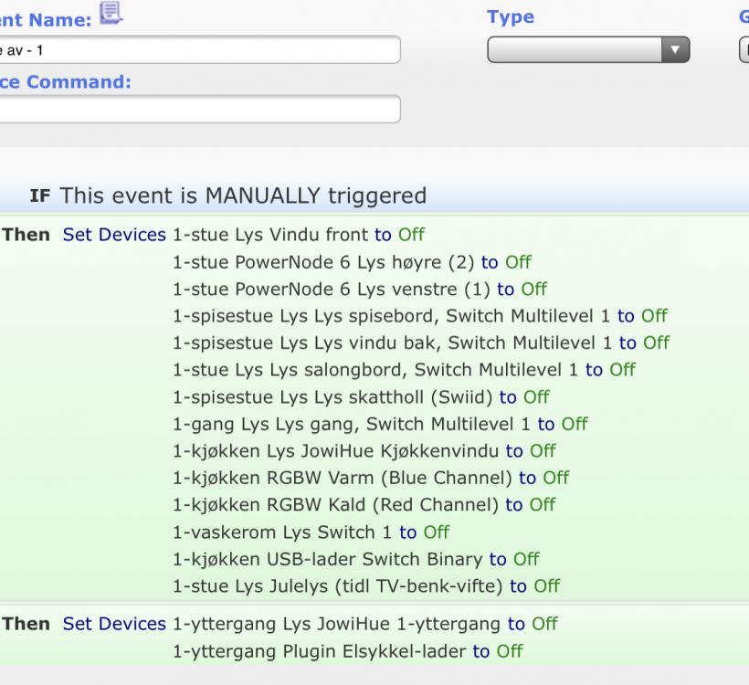 1. Jeg har vel ingen events for å slå av alle lys i et rom. Jeg har for «alle av» når vi reiser bort/nattmodus. Det gjør jeg så enkelt som dette: