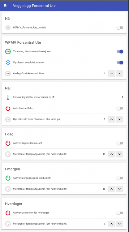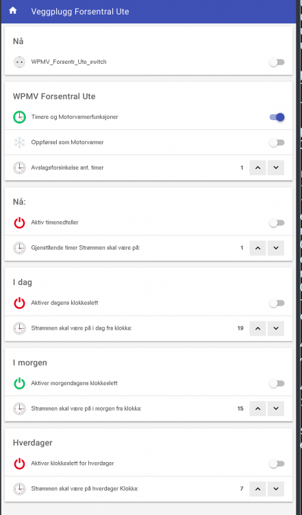 Skrev ferdig (for denne gang, tror jeg da akkurat nå) en mer generell regel i HABApp slik at jeg har Wallplugs programmerbar på klokkeslett og ta hensyn til oppvarmingstid for motorvarmere. Disse WallPluggene er plassert rundt om på gården og er en mix av zigbee og z-wave. For å få fruens motorvarmer til å skjønne konseptet "Helg" så ble den regelen sånn: Plasserte også ut diverse dingser jeg hadde liggende ubrukt som signal-routere på z-wave på strategiske steder. Nye zigbee WallPlugs ble også satt opp dær z-wave ikke rekker. 4-hopp-grensa på z-wave er og blir en begrensning for meg. Lagde nye sitemaps for timere og motorvarmer funksjon på WallPluggene (screenshots): Sitemaps er genialt, de er veldig kjapt å ta opp mobilen for å endre settinger i OpenHAP-Appen. Ikke porno, men funksjonell, også utenfor eget WiFi-nett.2 poeng