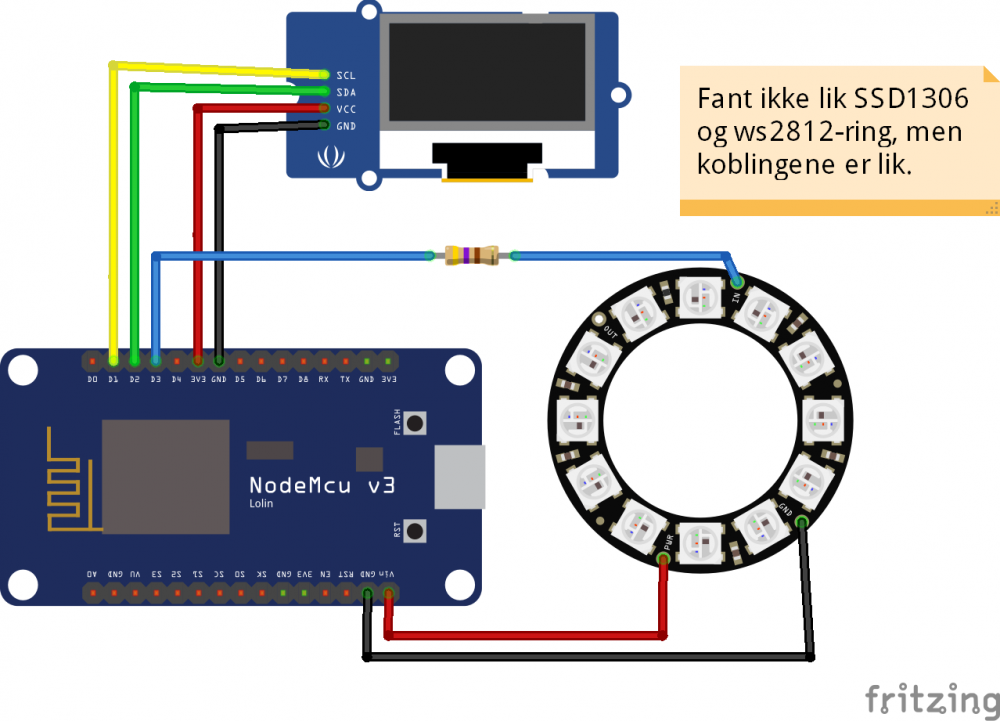 Byggetråd for forbruksmåler / display for lettere å visualisere strømforbruket i tilfelle noen har interesse av å lage noe lignende. Tips for videreutvikling og hjelp/kommentarer til kode blir satt pris på. Jeg skal få lagt opp flere bilder og beskrivelse av komponenter og koblingsdiagram. Backend oppsettet mitt bærer litt preg av at veien blir til mens du går. Det er ikke nødvendig å bruke både python-scriptet og Node-red, det går fint an å hente spotprisen via python , eller benytte seg av node-red for å lese modbus-til-usb adapteret som enkelte i "Lesing av HAN - The easy way" tråden har gjort. Men nåværende oppsett er stabilt, så jeg kommer ikke til å skrive det om enda. 1) Node-red blir brukt til å hente spotpris fra Tibber, inject-noden er et cron basert og trigges 2 ganger i timen (hvert 30 minutter, i tilfelle første trigger feiler). // Cron utrykket trigger en "Post to tibber" med følgende innhold: msg.payload = { "query" : "{viewer {homes {currentSubscription {priceInfo {current {total startsAt }}}}}}" }; msg.headers = { "Authorization" : "Bearer din-tibber-token-aabbccdd-1234", "Content-Type" : "application/json" }; return msg; 2) Funksjon "set spotpris as global variable": Setter spotprisen til en global variabel ("strompris") i node-red for bruk i en annen flow. // Lagrer/setter spotprisen fra Tibber i en global variabel som kan brukes i MQTT flow senere. var newMsg = {payload: msg.payload.data.viewer.homes[0].currentSubscription.priceInfo.current.total }; global.set("strompris",newMsg.payload); return newMsg; // Henter forbruksdata via MQTT på "ams/Act_Pow_P_Q1_Q4", // disse dataene kommer somsagt på influx line protocol format // hos meg. // Eksempel: "Act_Pow_P_Q1_Q4,name=Act_Pow_P_Q1_Q4 value=2047" // // Jeg ønsker kun verdien, så jeg splitter på '='. // Denne kombineres med spotprisen som blir hentet ut fra // global "strompris" variabel i node-red og sendes ut // til ny MQTT topic som NodeMCU/forbruksmåleren bruker. // Jeg brukte ';' som delimiter mellom power og spotpris. // Innholdet i "Combine AMS power and spotpris" funksjonen var values = msg.payload.split('='); var power = values[2]; var spotpris = global.get("strompris"); msg = {payload: power +";" + spotpris}; return msg; Forbruket leses via HAN porten fra AMS ved hjelp av test_rx og en modbus til USB adapter. Jeg har brukt følgende script fra brukeren Berland her på forumet (Håper det går greit å legger ut modifisert versjon her). I tillegg til å sende JSON til MQTT så ønsket jeg å sende influx line protocol syntax til MQTT for enkelt å sende til influxdb ved bruk samme python script/Node-red eller Telegraf. # Modified from https://www.hjemmeautomasjon.no/forums/topic/2873-lesing-av-han-the-easy-way-tm-wip/?do=findComment&comment=39623 import subprocess import paho.mqtt.client as mqtt import json import sys import requests from requests.exceptions import HTTPError # If the binary is still active for some reason, kill it subprocess.call("killall test_rx >/dev/null", shell=True) proc = subprocess.Popen(['./test_rx','-n'], stdout=subprocess.PIPE) def on_connect(client, userdata, flags, rc): pass def on_disconnect(client, userdata, rc=0): sys.exit(1) client = mqtt.Client() client.on_connect = on_connect client.on_disconnect = on_disconnect client.connect('mqttserver', 1883) print "Connected" cumulativejson = '' cumulativeInfluxLine = '' try: for line in iter(proc.stdout.readline, ''): line = line.rstrip() cumulativejson += line if line[-1:] == '}': try: amsJson = json.loads(cumulativejson) client.publish('power/ams', cumulativejson) for key in amsJson: value = amsJson[key] if isinstance(value, int) or isinstance(value, float): cleanValue = str(value).replace(" ","") influxLineData = '%(key)s,name=%(key)s value=%(cleanValue)s' % locals() mqttTopic = 'ams/' + key client.publish(mqttTopic, influxLineData) cumulativejson = '' except UnicodeDecodeError: # Sometimes we get something strange # on the serial line, just ignore it. cumulativejson = '' continue except Exception as e: print(e) proc.terminate() sys.exit(1) # Let systemd restart us Koden som kjøres på NodeMCUen kan også sees her: https://github.com/Olavae/mqtt-power-meter/blob/main/MqttPowerSpotMeter.ino // // Power usage display with current spot price using OLED and Neopixel. // Uses a NodeMCU board with wifi to recieve a single MQTT message on // the form powerUsage;spotprice using ';' as a delimiter/IFS then // splits the message into two variables to visualise them. // #include <ESP8266WiFi.h> #include <PubSubClient.h> #include <Adafruit_NeoPixel.h> // Following 4 are needed for SSD1306 oled display #include <SPI.h> #include <Wire.h> #include <Adafruit_GFX.h> #include <Adafruit_SSD1306.h> #define PIXELPIN D3 // Datapin for neopixel #define NUMPIXELS 24 // Number of neopixels #define DELAYVAL 500 // Time (in milliseconds) to pause between pixels #define SCREEN_WIDTH 128 // OLED display width, in pixels #define SCREEN_HEIGHT 64 // OLED display height, in pixels #define OLED_RESET -1 // Reset pin # (or -1 if sharing Arduino reset pin) //OLED display (Uses GPIO5 (D1) (SCL) and GPIO4 (D2) (SDA) as standard Adafruit_SSD1306 display(SCREEN_WIDTH, SCREEN_HEIGHT, &Wire, OLED_RESET); // Neopixels / ws2812 compatible leds Adafruit_NeoPixel pixels(NUMPIXELS, PIXELPIN, NEO_GRB + NEO_KHZ800); // Update these with values suitable for your network. const char* ssid = "Your-Wifi-Network"; const char* password = "wifi-passphrase"; const char* mqtt_server = "10.0.0.5"; // Your MQTT broker // Set your variable for "nettleie" to your power company. const float nettleie = 42.61; // BKK nettleie variabel del, Price in øre. const char* powerPriceTopic = "strompris"; // Your MQTT topic where you publish "powerUsage;spotpris" const char* delimiter = ";"; WiFiClient espClient; PubSubClient client(espClient); unsigned long lastMsg = 0; #define MSG_BUFFER_SIZE (50) char msg[MSG_BUFFER_SIZE]; void setup_wifi() { delay(10); // We start by conne