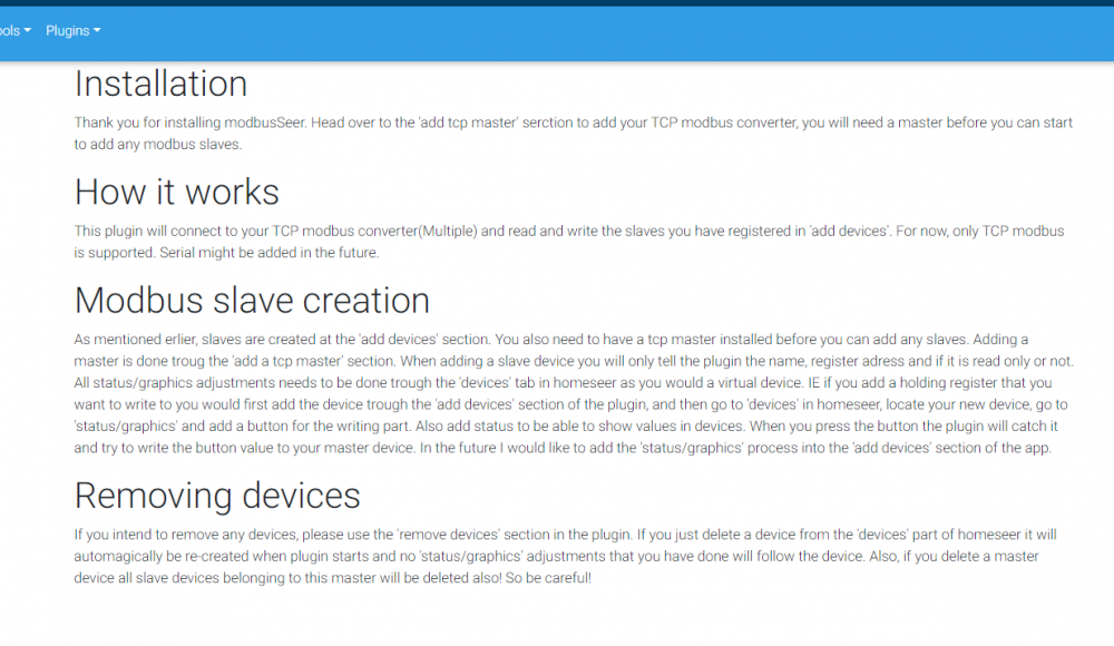 Jeg er komt i gang og har noe som for meg iallefall er stabilt og funksjonelt(på en måte). Men jeg ønsker å få den testet på flere modbus systemer og ønsker all tilbakemelding jeg kan få til å få laget en skikkelig god modbus plugin til homeseer brukere
