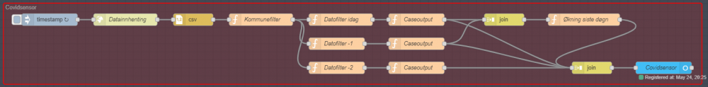 Etter ønske om å få rask oversikt i Home Assistant over nye korona-smittede i vår kommune fikk jeg satt opp en flyt i Node-RED som henter og bruker data fra https://www.covid19data.no/ / https://github.com/thohan88/covid19-nor-data (Credits til nevnte). Kode for flyt om noen er interessert: [{"id":"7dd6bce.af8c844","type":"group","z":"bb6e8086.6c545","name":"Covidsensor ","style":{"stroke":"#ff0000","fill":"#ff0000","fill-opacity":"0.15","label":true},"nodes":["90eed3d2.3e261","b0fff39.6d0931","ea569ee3.85a95","b802a2b2.ff655","6a4e5870.ca4be8","c7c59bd.5518268","ef5ccb12.ee96b8","b081c8a7.91d578","386b5ad0.348216","cb51e487.ab1338","ab0d46b0.c3f558","810385c3.3d2c58","b0f32536.4af398","5f09b0de.93084"],"x":74,"y":1639,"w":1752,"h":202},{"id":"90eed3d2.3e261","type":"csv","z":"bb6e8086.6c545","g":"7dd6bce.af8c844","name":"","sep":",","hdrin":true,"hdrout":"none","multi":"mult","ret":"\\n","temp":"date,date_time,kommune_bydel_no,kommune_bydel_name,bydel_no,bydel_name,kommune_no,kommune_name,fylke_no,fylke_name,population,cases","skip":"0","strings":true,"include_empty_strings":false,"include_null_values":false,"x":550,"y":1680,"wires":[["cb51e487.ab1338"]]},{"id":"b0fff39.6d0931","type":"http request","z":"bb6e8086.6c545","g":"7dd6bce.af8c844","name":"Datainnhenting","method":"GET","ret":"txt","paytoqs":"ignore","url":"https://raw.githubusercontent.com/thohan88/covid19-nor-data/master/data/01_infected/msis/municipality_and_district.csv","tls":"","persist":false,"proxy":"","authType":"","x":380,"y":1680,"wires":[["90eed3d2.3e261"]]},{"id":"ea569ee3.85a95","type":"function","z":"bb6e8086.6c545","g":"7dd6bce.af8c844","name":"Caseoutput","func":"let cases = msg.payload.pop().cases;\nmsg.payload = cases;\nmsg.topic = \"Dag0\";\nreturn msg;","outputs":1,"noerr":0,"initialize":"","finalize":"","libs":[],"x":1110,"y":1680,"wires":[["ab0d46b0.c3f558","810385c3.3d2c58"]]},{"id":"b802a2b2.ff655","type":"function","z":"bb6e8086.6c545","g":"7dd6bce.af8c844","name":"Datofilter -1","func":"\nvar yesterday = new Date((new Date()).valueOf() - 1000*60*60*24).toISOString();\nu = yesterday.substr(0,10);\nmsg.payload = msg.payload.filter(e => e.date == u);\nreturn msg;","outputs":1,"noerr":0,"initialize":"","finalize":"","libs":[],"x":910,"y":1740,"wires":[["ef5ccb12.ee96b8"]]},{"id":"6a4e5870.ca4be8","type":"function","z":"bb6e8086.6c545","g":"7dd6bce.af8c844","name":"Datofilter -2","func":"\nvar yesterday = new Date((new Date()).valueOf() - 1000*60*60*48).toISOString();\nu = yesterday.substr(0,10);\nmsg.payload = msg.payload.filter(e => e.date == u);\nreturn msg;","outputs":1,"noerr":0,"initialize":"","finalize":"","libs":[],"x":910,"y":1800,"wires":[["b081c8a7.91d578"]]},{"id":"c7c59bd.5518268","type":"function","z":"bb6e8086.6c545","g":"7dd6bce.af8c844","name":"Datofilter idag","func":"var t=(new Date()).toISOString();\n//var yyyy=(new Date()).getUTCFullYear();\n//var mm=(new Date()).getUTCMonth();\n//var dd=(new Date()).getUTCDate();\nvar u = t.substr(0,10);\nmsg.payload = msg.payload.filter(e => e.date == u);\nreturn msg;","outputs":1,"noerr":0,"initialize":"","finalize":"","libs":[],"x":920,"y":1680,"wires":[["ea569ee3.85a95"]]},{"id":"ef5ccb12.ee96b8","type":"function","z":"bb6e8086.6c545","g":"7dd6bce.af8c844","name":"Caseoutput","func":"let cases = msg.payload.pop().cases;\nmsg.payload = cases;\nmsg.topic = \"Dag1\";\nreturn msg;","outputs":1,"noerr":0,"initialize":"","finalize":"","libs":[],"x":1110,"y":1740,"wires":[["ab0d46b0.c3f558","810385c3.3d2c58"]]},{"id":"b081c8a7.91d578","type":"function","z":"bb6e8086.6c545","g":"7dd6bce.af8c844","name":"Caseoutput","func":"let cases = msg.payload.pop().cases;\nmsg.payload = cases;\nmsg.topic = \"Dag2\";\nreturn msg;","outputs":1,"noerr":0,"initialize":"","finalize":"","libs":[],"x":1110,"y":1800,"wires":[["ab0d46b0.c3f558"]]},{"id":"386b5ad0.348216","type":"function","z":"bb6e8086.6c545","g":"7dd6bce.af8c844","name":"Økning siste døgn","func":"var a = (msg.payload.Dag0);\nvar b = (msg.payload.Dag1);\nvar siste = a - b;\nmsg.payload = siste;\nmsg.topic = \"Diff\";\nreturn msg;","outputs":1,"noerr":0,"initialize":"","finalize":"","libs":[],"x":1530,"y":1680,"wires":[["ab0d46b0.c3f558"]]},{"id":"cb51e487.ab1338","type":"function","z":"bb6e8086.6c545","g":"7dd6bce.af8c844","name":"Kommunefilter","func":"msg.payload = msg.payload.filter(e => e.kommune_name == \"Trondheim\");\nreturn msg;","outputs":1,"noerr":0,"initialize":"","finalize":"","libs":[],"x":720,"y":1680,"wires":[["c7c59bd.5518268","b802a2b2.ff655","6a4e5870.ca4be8"]]},{"id":"ab0d46b0.c3f558","type":"join","z":"bb6e8086.6c545","g":"7dd6bce.af8c844","name":"","mode":"custom","build":"object","property":"payload","propertyType":"msg","key":"topic","joiner":"\\n","joinerType":"str","accumulate":false,"timeout":"","count":"4","reduceRight":false,"reduceExp":"","reduceInit":"","reduceInitType":"","reduceFixup":"","x":1550,"y":1800,"wires":[["b0f32536.4af398"]]},{"id":"810385c3.3d2c58","type":"join","z":"bb6e8086.6c545","g":"7dd6bce.af8c844","name":"","mode":"custom","build":"object","property":"payload","propertyType":"msg","key":"topic","joiner":"\\n","joinerType":"str","accumulate":false,"timeout":"","count":"2","reduceRight":false,"reduceExp":"","reduceInit":"","reduceInitType":"","reduceFixup":"","x":1330,"y":1680,"wires":[["386b5ad0.348216"]]},{"id":"b0f32536.4af398","type":"ha-entity","z":"bb6e8086.6c545","d":true,"g":"7dd6bce.af8c844","name":"Covidsensor","server":"6ba97421.43379c","version":1,"debugenabled":false,"outputs":1,"entityType":"sensor","config":[{"property":"name","value":"smitte_sted"},{"property":"device_class","value":""},{"property":"icon","value":"mdi:hospital-building"},{"property":"unit_of_measurement","value":"nye smittede"}],"state":"payload.Diff","stateType":"msg","attributes":[{"property":"Dagens smittetall","value":"payload.Dag0","valueType":"msg"},{"property":"Smittetall dag 1","value":"payload.Dag1","valueType":"msg"},{"property":"Smittetall dag 2","value":"payloa