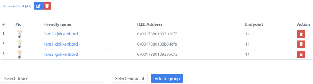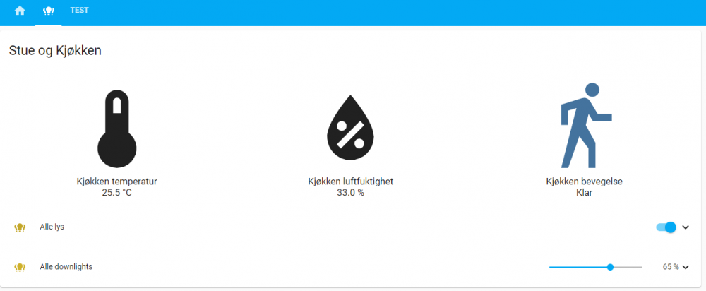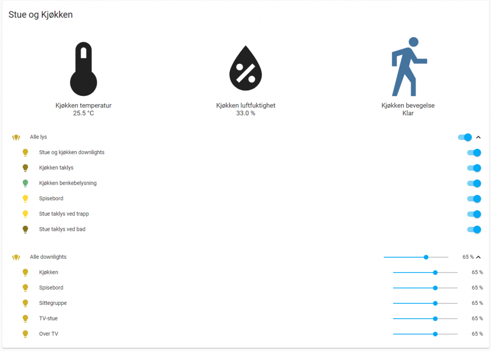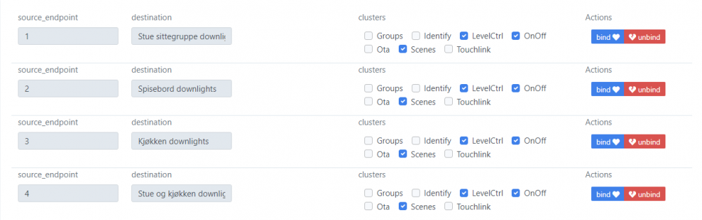 Takk for veldig godt innlegg, det er god hjelp på vegen! Dette gjør jo ting mye enklere ja. Z2M ser foreløpig ut til å støtte mest enheter og ZHA virket (som du også sier lenger ned) litt uferdig og lite brukervennlig i min testing. Så gjorde noen tester på Z2M og koblet opp alle lysene i stue og kjøkken nå i første omgang. Fikk testet dette i Z2M og det ser ut til å fungere bra. Har lagd meg en del grupper (en for alle lysene og så grupper for hver sone). Og så fått satt opp binding. Gruppen på endpoint 4 er her alle downlights. Så det virker som grupper kan bindes på denne måten uten at det telles på samme måte i begrensningen på 30 lys. Kontrollen er også "instant" så det er bra. Var usikker på hvilke clusters som skulle bindes, så valgte alle. Men kun de tre viste ble lagret, så da antar jeg det er de som er de riktige å binde opp. For de som lurer på disse Sunricher-panelene så fungerer det slik: Ved å velge gruppe 1 til 4 styrer man brightness kun på disse. Man kan holde inne gruppe-knappen for å slå av og på kun disse Av/på-bryteren styrer alle lys av og på, uansett valgt gruppe S1 til S4 setter preset for alle lys, ikke avhengig av valgt gruppe En kan ikke sette fargetemperatur med panelet så vidt jeg vet. Men presetene lagrer fargetemperatur. Punkt 2 og 3 var litt annerledes enn jeg hadde tenkt, da jeg trodde f.eks. preset var avhengig av valgt gruppe. Men sånn som det er er det kanskje enklere enn å skulle huske hva preset S1 til S4 er for 4 forskjellige grupper. Takk for tipset. Leste denne og tror jeg har fått med meg de viktigste prinsippene. Gjorde en scan på unifi-nettverket og endte opp med Zigbee-kanal 25. Var en stund på veg til å bruke kanal 26, men det kan se ut som en del utstyr kun støtter kanal 15,20 og 25 (?). Ga opp å bytte kanal da jeg hadde ZHA installert. Det krevde en bellows-kommando og siden jeg har Hass OS fant jeg ikke ut hvordan jeg fikk kjørt den. Så måtte inn med Phoscon for å få byttet kanal. Phoscon ville derimot ikke oppgradere firmware på Conbee 2. Og ikke fungerte det på en Windows 10 VM. Fikk det til slutt til på en annen Windows-PC. I ettertid leste jeg at det kan være noe med timingen (at du kanskje må kjøre gcfflasher-kommandoen et visst antall sekunder (3?) etter at sticken er plugget inn, som tips for andre som måtte lese dette). Takk, skal ha det i bakhodet når jeg kommer til å få satt opp de. Tror ikke de blir så mye brukt (og ikke samtidig med lys) så forhåpentligvis blir det bra. Har felt inn skjulte høyttalere i taket og satt inn en 12-kanals forsterker i kjellerboden. Bruker bl.a. Chromecast som kilde. Og selv om jeg har stemmestyring etc. ønsker jeg lett tilgjengelige knapper for kjapt å kunne starte avspilling og kontrollere volum. Så håpet er at disse er egnet til det, time will show.. Nå som jeg har fått satt opp dette i Z2M kan jeg få testet og se hvordan det fungerer eller ikke fungerer hos meg. Fikk også kommet i gang med å sette opp ting i Lovelace, så da begynner jeg å komme på glid ift migreringen min fra Indigo til Home Assistant Fikk ikke ned ikon-størrelsen, men det lar seg sikkert løse. Så blir vel neste steg å få Sunricher-paneler osv til å fungere best mulig sammen med Zwave-lysene som også er i området..1 poeng