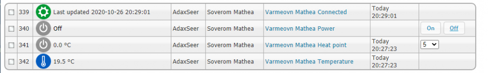 Om jeg ikke husker feil når det gjelder AdaxSeer så har jeg ikke fikset det slik at den blir oppdatert i HomeSeer idet man skifter verdi, men idet verdien faktisk har endret seg hos Adax. Derfor vil du ikke se noe i Device History siden kallet feilet, men ingen oppdatering ble gjort. Jeg har såvidt begynt å titte på problemet. Usikker på når jeg har noe fornuftig i havn. Det jeg bør få løst er følgende: * Stoppe at endringer sendes til Adax hvis det er mindre enn 1 minutt siden sist endring. * Lage en action for å kunne endre mer enn ett rom av gangen når man gjør det fra Event. * Oppdatere HomerSeer lokalt med ny verdi selv om denne ikke er oversendt til Adax (eventuelt oppdatere idet oversendingen gikk ok)1 poeng
