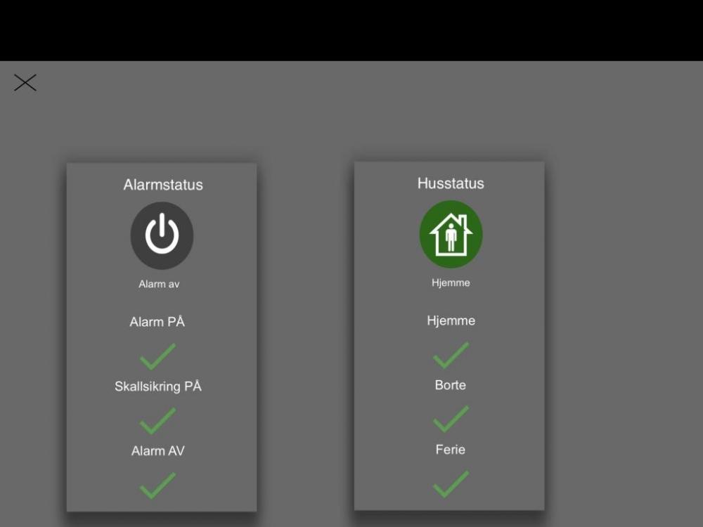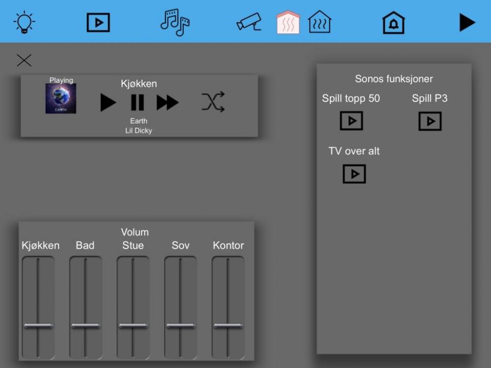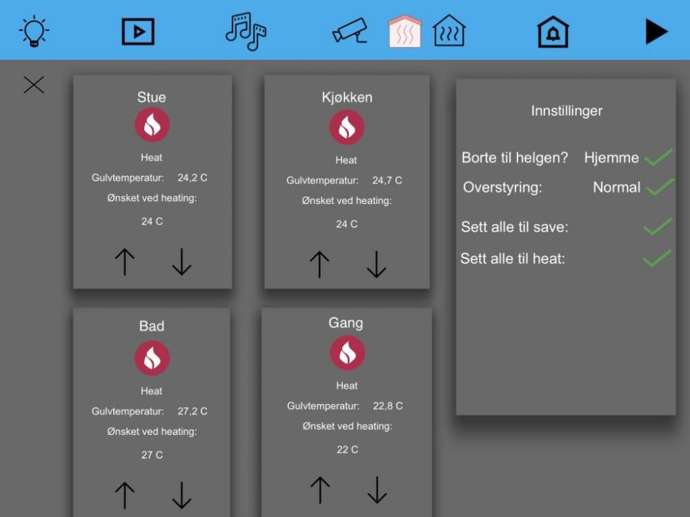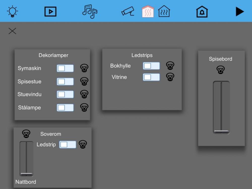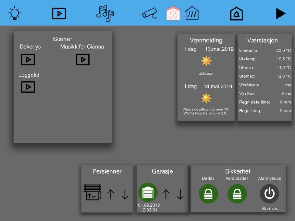 Selv om jeg har jobbet med HMI helt siden ASEA Tesselator var det store på begynnelsen av -80 tallet så er det ikke så veldig sikkert at mine bilder er så veldig imponerende men jeg prøver nå å få til en visuell nytteverdi så får det visuelle designet bli som det blir... Standard HomeSeer bakgrunnsbilder og alle bildevalg i venstre side. Slidere og knapper er både for statusindikering og betjening. Etterhvert som flere bilder dukker opp så blir bildevalgknappene halvert i størrelse. Noen hovedbilder: Og noen sekundære bilder: Batteristatus på alle batteridrevne enheter: Brannvarslere:1 poeng