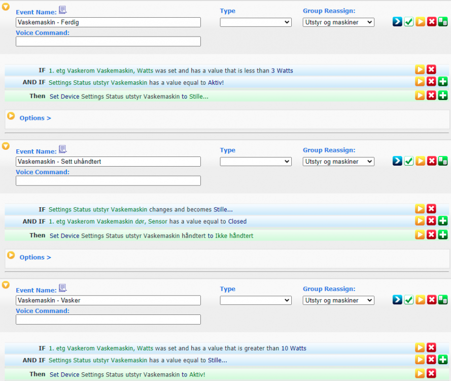 Bruker ikke de direkte, jeg har en eldre 16A type fra AeoTec Men er det vits i å bruke to forskjellige typer? De koster jo stort sett det samme, og det skader jo ikke å ha marginene på sin side. Jeg har 16A på alle tekniske installasjoner (utenom de som krever mer, det AeoTec Heavy Duty på komfyrtopp og varmtvannsbereder). Tja... den må jo kunne rapportere strømforbruk, men så lenge den gjør det med 2-3 minutters mellomrom så går det bra. Ikke sett rapporteringen til å være for ofte fordi 1) det har du ikke bruk for og 2) det spammer nettverket ditt med unødvendig mye data. Your wish is my command. Eksempel vaskemaskin. Merk at vi har en magnetbryter på døren til vaskemaskinen... To devicer. En som settes til "Aktivt!" når maskinen sviver, og en som forteller notifikasjonene om siste vask er "håndtert" (dvs. hengt opp eller puttet i tørketrommelen) eller ei. Automasjonene er i korthet slik: Maskinen starter og trekker strøm, da blir "Vaskemaskin" satt til "Aktivt!". Når strømforbruket har vært lavt lenge nok, er maskinen ferdig og "Vaskemaskin" settes til "Stille...". Da blir også "Håndtert" satt til "Ikke håndtert". "Håndtert"-devicen blir satt til "Håndtert" når døren på vaskemaskinen åpnes. Notifikasjoner trigges når "Vaskemaskin" endres til "Stille...", og denne gjentas hver halve time til "Håndert" er... erm... "håndtert". Da glemmer vi ikke at vi vasker klær. ... og tilhørende notifikasjoner: ... som gjentas hvis man ikke "håndterer" maskinen:1 poeng