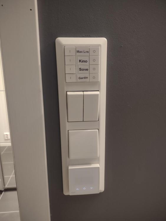 Lagt til scene bryter i hjemmekinorommet/hvilerom. Enkelt forklart: Trykk og ting vil skje.... 😁 Den utfyllende forklaring. Max lys - har fire funksjoner: ett trykk på - lys skrur seg på med behagelig lysstyrke. Langt trykk - Max belysning feks ved romvask og fikling bak AV-rack. Av knapp (0) - sier seg litt selv, men i tillegg til å slå av belysningen i rommet, slås også amper, tv og av-prosessor av i riktig rekkefølge om Kino modus er av. Kino - på knapp har tre funksjoner. Kort trykk - Lys dempes, preamp slår seg på, kun en amp slår seg på (stereo) sub og TV slår seg på, varmeovn settes til 21 grader og ventilasjon i rommet settes på. Langt trykk så slår ovennevnte på i tillegg til resten av de 5 ampene slik at kinoen er klar for 7.1.4 oppsett (Atmos) rullegardin går ned, samt full demping på lysdimmer. Kino av - setter kinomodus i normal modus. Rullegardin går opp. Sove - brukes for å fortelle HomeSeer at her skal det soves. Alt av varme, unntatt varmekabler slås av, lys dempes og slås helt av etter 2 min. Ventilasjon slås på. rullegardin går ned. Av - så slås belysning på og varme i rommet går til normal posisjon. Gardin - styrer rullegardin IKEA fyrtur ned og opp uavhengig av ovennevnte sceneknapper. Dobbel lysbryter styrer en Fibaro dimmer2 til veggbelysning Enkel bryter er hovedbryter for takbelysning (Hue lampe) Så en Heatit Z-trm2fx til varme i gulv. Bruker z-wave plug-inn brytere til ampene og suben. Ellers styrer en Logitech Harmony Hub receivern (prosessor), TV'en og Blu-Ray spillern.2 poeng