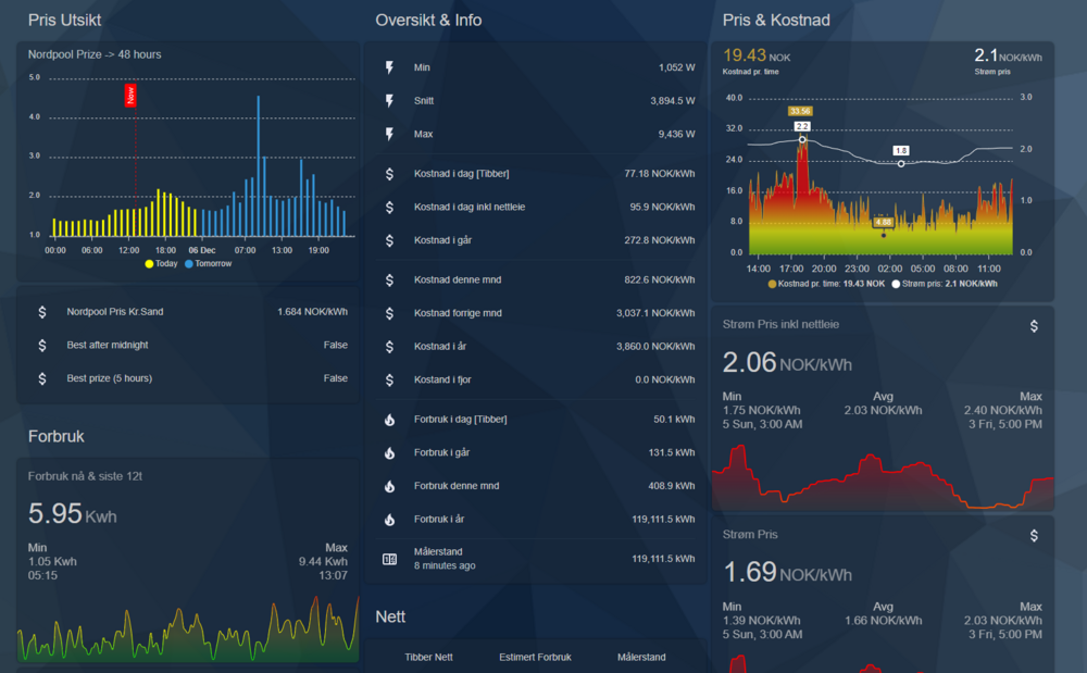 Jeg tenkte å ta en kjapp wirte up på hvordan jeg har begrenset effektleddet med openHAB. Jeg ser at det skrives noe om PID andre steder men det ble for avansert for meg å sette meg inn i Før man begynner må man ha inn ActiveImportPower fra HAN-porten på en eller annen måte. Jeg bruker kortet jeg lagde i 2017/18 som blant annet @ArnieO har tatt til nye høyder. Først lagrer jeg alle verdier i InfluxDB for enkelhets skyld med følgende dette python-script. Det kjører som en service. # -*- coding: utf-8 -*- import random import time from datetime import datetime from paho.mqtt import client as mqtt_client from influxdb import InfluxDBClient broker = 'openhabian.localdomain' port = 1883 topic = "esp/ams/activeimportpower" client_id = f'python-ams-mqtt-influx-{random.randint(0, 1000)}' dbname = "ams" dbuser = "ams" dbpass = "ams" def connect_mqtt(): def on_connect(client, userdata, flags, rc): if rc == 0: print("Connected to MQTT Broker!") else: print("Failed to connect, return code %d\n", rc) # Set Connecting Client ID client = mqtt_client.Client(client_id) client.on_connect = on_connect client.connect(broker, port) return client def subscribe(client: mqtt_client, dbclient: InfluxDBClient): def on_message(client, userdata, msg): print(f"Received `{msg.payload.decode()}` from `{msg.topic}` topic") store(dbclient, msg.payload.decode()) client.subscribe(topic) client.on_message = on_message def store(dbclient: InfluxDBClient, power): json_body = [ { "measurement": "activeimportpower", "time": datetime.now(), "fields": { "value": int(power) } } ] dbclient.write_points(json_body) def run(): dbclient = InfluxDBClient('localhost', 8086, dbuser, dbpass, dbname) client = connect_mqtt() subscribe(client, dbclient) client.loop_forever() if __name__ == '__main__': run() Deretter kalkulerer jeg gjeldende kWh-forbruk hver andre minutt med dette scriptet. Det kjører som en cron-jobb (*/2 * * * *). # -*- coding: utf-8 -*- import random import time from datetime import datetime from paho.mqtt import client as mqtt_client from influxdb import InfluxDBClient broker = 'openhabian.localdomain' port = 1883 topic = "esp/ams/avaragewh" client_id = f'python-avarage-wh-{random.randint(0, 1000)}' dbname = "ams" dbuser = "ams" dbpass = "ams" def connect_mqtt(): def on_connect(client, userdata, flags, rc): if rc != 0: print("Failed to connect, return code %d\n", rc) # Set Connecting Client ID client = mqtt_client.Client(client_id) client.on_connect = on_connect client.connect(broker, port) return client def publish(client, dbclient): avarage = avarage_wh(dbclient) # If avarage is None we probably don't have enough data to calculate the avarage if avarage is None: return result = client.publish(topic, avarage) # result: [0, 1] status = result[0] if status != 0: print(f"Failed to send message to topic {topic}") def avarage_wh(dbclient): hour_start = str(datetime.now().replace(microsecond=0, second=0, minute=0)).replace(' ', 'T') result = dbclient.query(f"SELECT * FROM activeimportpower WHERE time >= '{hour_start}Z'") count = 0 sum = 0 try: for val in list(result)[0]: count += 1 sum += val['value'] except: return None return round(sum / count) def run(): dbclient = InfluxDBClient('localhost', 8086, dbuser, dbpass, dbname) client = connect_mqtt() publish(client, dbclient) client.disconnect() if __name__ == '__main__': run() Da får vi gjeldende kWh ut på mqtt-topic "esp/ams/avaragewh" som vi kan bruke i openHAB til å gjøre noen beslutninger med disse reglene: var high_kwh_threshold = 4800 // Turn off items if kWh is above this number var low_kwh_threshold = 4600 // Turn on items if kWh is below this number var min_current_w = 4500 // If we need to turn off items, turn off enough items so that the current watt usage is below this number var max_current_w = 6000 // If we can turn on items, turn on enough items so that the current watt usage is below this number rule "high kwh" when Item AMS_AvarageWh changed then // If the avarage is above 4800 kWh we need to bring the current usage below 4500w if ((AMS_AvarageWh.state as Number) > high_kwh_threshold) { var current_w = AMS_ActiveImportPower.state as Number // Turn off office if (current_w > min_current_w && OfficeHeat_Switch.state == ON) { OfficeHeat_Switch.sendCommand(OFF) current_w -= OfficeHeat_Electricmeterwatts.state as Number // Subtract current usage } // Turn off hallway if (current_w > min_current_w && (HallwayFloor_Thermostatmode.state as Number) == 1) { HallwayFloor_Thermostatmode.sendCommand(0) current_w -= HallwayFloor_Electricmeterwatts.state as Number // Subtract current usage } // Turn off bath room if (current_w > min_current_w && (BathRoomFloor_Thermostatmode.state as Number) == 1) { BathRoomFloor_Thermostatmode.sendCommand(0) current_w -= BathRoomFloor_Electricmeterwatts.state as Number // Subtract current usage } // Turn off living room if (current_w > min_current_w && LivingHeat_Switch.state == ON) { LivingHeat_Switch.sendCommand(OFF) current_w -= LivingHeat_Electricmeterwatts.state as Number // Subtract current usage } } end rule "low kwh" when Item AMS_AvarageWh changed then //logDebug("ams", "LOW KWH START") // If the avarage is below 4600 kWh we can start to bring the current usage up if ((AMS_AvarageWh.state as Number) < low_kwh_threshold) { var current_w = AMS_ActiveImportPower.state as Number // Turn on living room if (current_w < max_current_w && LivingHeat_Switch.state == OFF) { LivingHeat_Switch.sendCommand(ON) current_w += 1200 // Based on experience } // Turn on bath room if (current_w < max_current_w && (BathRoomFloor_Thermostatmode.state as Number) == 0) { BathRoomFloor_Thermostatmode.sendCommand(1) current_w += 800 // Based on experience } // Turn on hallway if (current_w < max_current_w && (HallwayFloor_Thermostatmode.state as Number) == 0) { HallwayFloor_Thermostatmode.sendCommand(1) current_w += 700 // Based on experience } // Turn on office if (current_w < max_current_w && OfficeHeat_Switch.state == OFF) { OfficeHeat_Switch