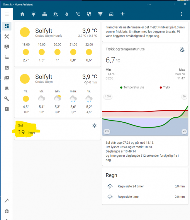 Her er et eksempel på hvordan jeg henter ut fra værmeldingen hvor mange timer med sol det er meldt fra nå og framover. Det kan brukes til å styre oppvarming i huset eller gardiner. Og det er lett å bytte ut dette til noe annet som antall dager med regn, antall timer med frost osv. Skal en ha antall timer så må en aktivere timebasert værmelding i met.no integrasjonen. Met.no integrasjonen skal da ha to sensorer. sensor: - platform: template sensors: timer_med_sol: friendly_name: Timer med sol unit_of_measurement: h value_template: >- {% set vars = namespace(count=0) %} {% set vars = namespace(found=true) %} {% set vars.count = 0 %} {% set l = state_attr('weather.orstad_utsyn_hourly','forecast')|map(attribute='condition')|list %} {% for item in l %} {% if vars.found == true and item == 'sunny' %} {% set vars.count = loop.index %} {% else %} {% set vars.found = false %} {% endif %} {% endfor %} {{ vars.count }}1 poeng