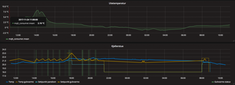 Jeg blei heller aldri fornøyd med hverken Device history eller Jon00DBchart. Er nå i gang med å teste Grafana, og det blir det i alle fall pene grafer av. Det er satt opp med MQTT-plugin i Homeseer som annonserer til en "MQTT-broker" på serveren min, videre til en Telegraf-agent som putter dataene inn i en InfluxDB-database, og dette plottes av grafana. Puh. Jeg har planer om å lage en guide fordi jeg tror flere kunne vært interessert i dette, men da må jeg først bli fornøyd med hvordan jeg har satt det opp her, og ha tid til å skrive en faktisk guide..1 poeng