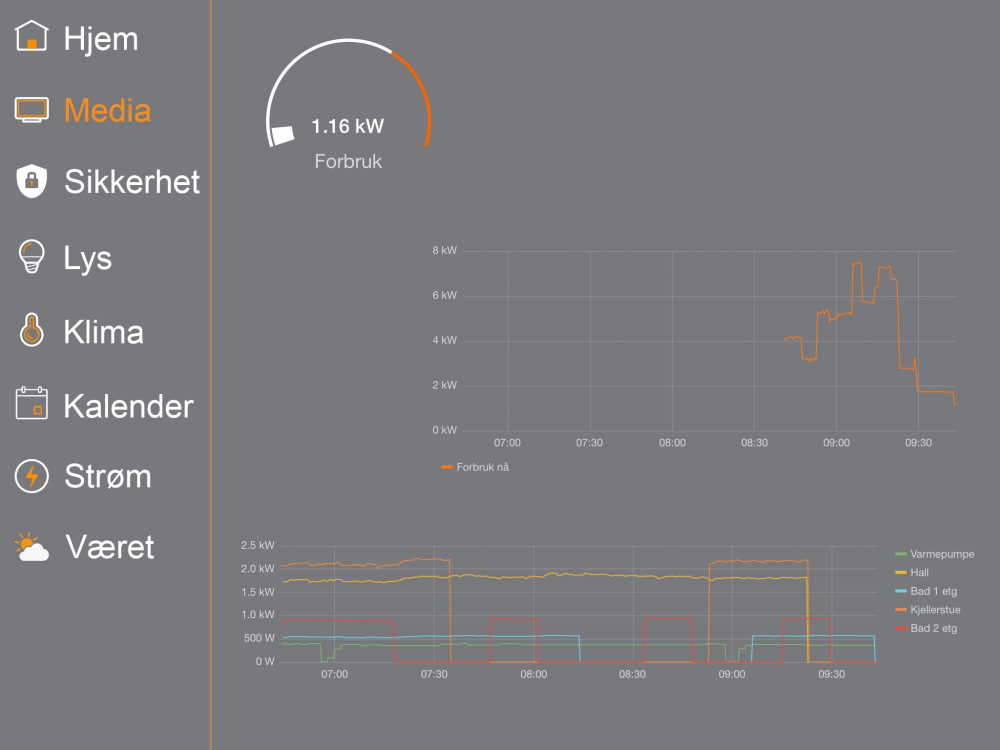 Fant ut i går at det ikke var helt på stell så måtte ordne det først. Her er da sånn grafene ser ut hos meg. Bare et testoppsett enda for å vise grafene. Dette ser mye bedre ut enn varianten med .png siden de er dynamiske. Png bilder fra Grafana har også mye forsinkelse og har dårligere bildekvalitet så tror dette er en bedre løsning. Jeg kan ikke filla om css og lignende, så dette er nok ikke den peneste løsningen Hvis noen har ideer om forbedringer så bare si ifra! Jeg regner med at en installasjon med InfluxDB og Grafana allerede er oppe å går. WARNING: Dette kommer til å få Grafana til å se ganske snodig ut i nettleseren. Vi endrer bare deler av et theme her. Jeg bruker Grafana kun til å holde endel grafer til HSTouch så da gjør det ingenting. Får å få til det her må man da gjøre; 1: Rediger index.html i mappen \GrafanaLabs\grafana\public\views. Legg til <link rel="stylesheet" href="public/sass/hstouch.css" type="text/css"> under Title. Lag en fil i /public/sass som heter hstouch.css (eller hva du vil) og kopier inn følgende; @charset "UTF-8"; .panel-container { background-color: #78797d !important; border: 0px solid #78797d !important; } .dashboard-container { background-color: #78797d !important; border: 0px solid #78797d !important; } Endre fargekoder til hva du vil. Sett samme fargekoder på alle siden det er avrundede hjørner på containeren og bakgrunnen vil da synes. Siden alt har !important tag vil da disse overstyre eksisterende css. Etter endringer er gjort i hstouch.css måtte jeg bruke hard-refresh (shift-F5) for å få vist endringene. Voila! Ny bakgrunnsfarge på grafer. For å få det her inn i HSTouch gjør man da; 1: Gå til din Grafana installasjon og klikk på header til en graf sånn at du får frem menylinjen. Klikk på "View" 2: Velg tidsområde for grafen i øvre høyre hjørne og oppdateringsfrekvens 3: Kopier linken i adresselinjen. Du skal bruke den og ikke den du får fra "Share" funksjonen. 4: Gå inn i HSTouch og legg til et nytt "Text" element. Endre følgende: - Sett IsHTML til "True" 5: Lim inn linken du har fra Grafana i "Text"-feltet. Endre ip-adresse hvis Grafana-server er på annen maskin. - Legg til &kiosk på slutten av link. Det burde da se noe slik ut: http://grafana-server:3000/d/uPW1yGoWk/new-dashboard-copy?orgId=1&refresh=5s&from=now-3h&to=now&theme=dark&panelId=6&fullscreen&kiosk 6: TADAA!!1 poeng