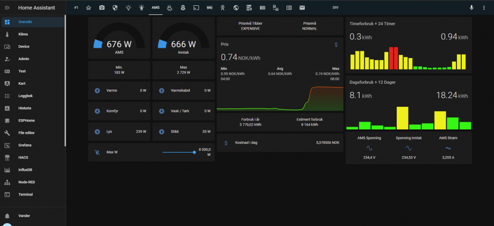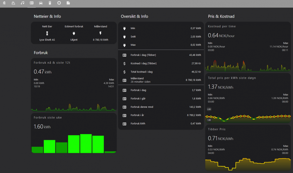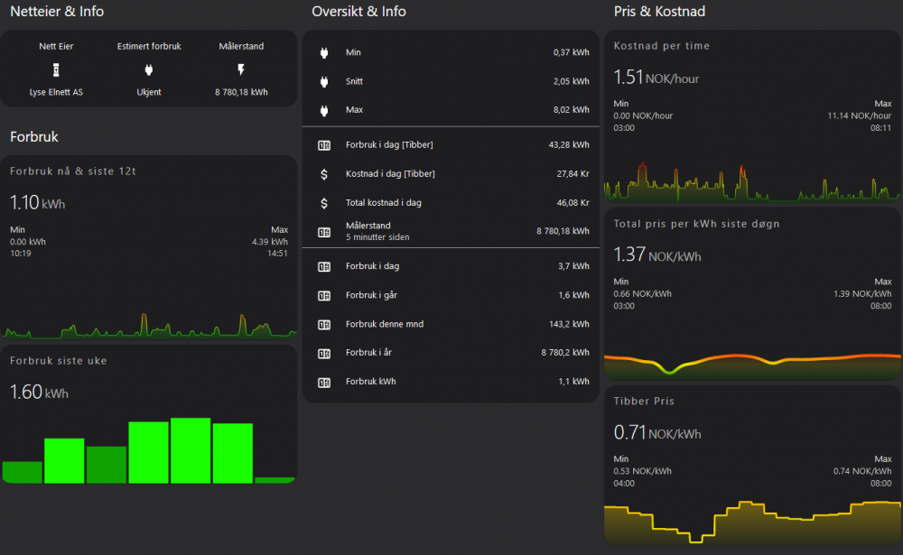 Vel, jeg deler gjerne "rotet" mitt med andre, men det er min første dag med å legge ut poster her, så ikke arrester meg om det er feil innrykk og rotete oppsett og kode 😁 Har hentet mye inspirasjon og kode fra denne tråden, og satt sammen etter beste evne. Alt virket fint frem Tibber endret fra attributter til egne sensorer. Fikk god hjelp i dag fra @Kim123 med å få på plass dag, mnd og år forbruk. TAKK! P.t. ser mitt Tibber dashboard kort slik ut: Ikke se på forbruk denne uke, da disse trenger noen dager for å oppdates med ny data etter dagens siste justeringer 😆 Får p.t. inn 19 entiteter fra Tibber integrasjonen, men har laget et par ekstra med ferre desimaler, litt omregning fra W til kWh, samt en som legger til nettleie (i mitt tilfelle 0,655 pr kWh) Legger ved filer som viser mitt oppsett som vist i bilde over. Håper det er noe hjelp i det som kommer herfra i dag 😜 Ellers kan jeg benytte sjansen å takke folk i både dette forum, og andre steder jeg har plukket opp en rekke små triks. Fikk opp første installasjon av Home Assistant for 5-6 uker siden, og foreløpig ser prosjektet slik ut: Tibber Sensors.txt Automation Day.txt Automation Month.txt Automation Year.txt Input numbers.txt YAML Card.txt YAML Dashboard.txt1 poeng