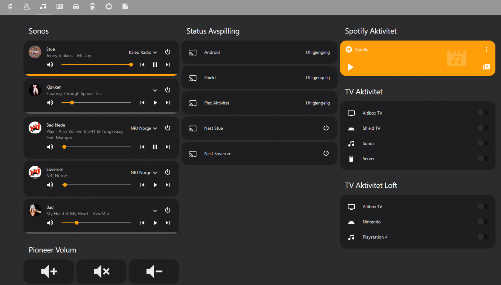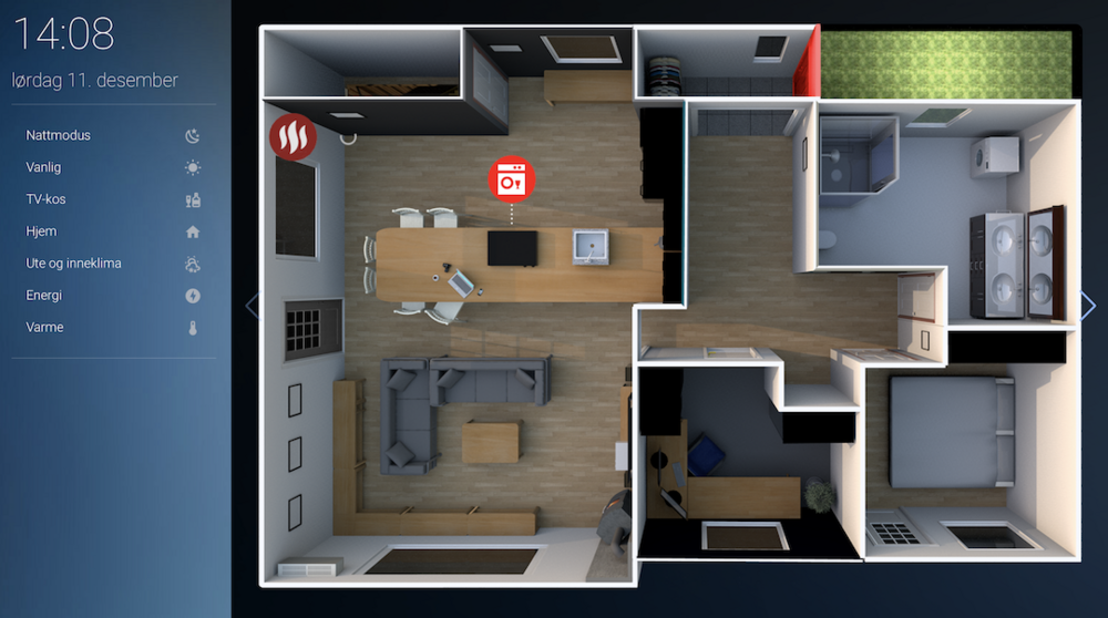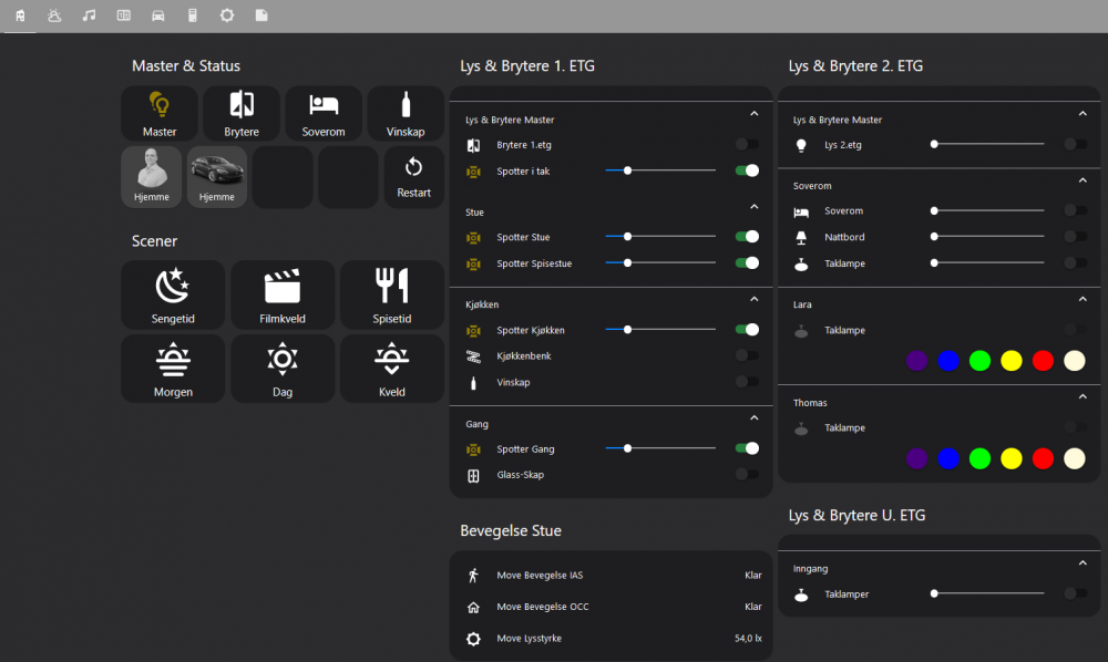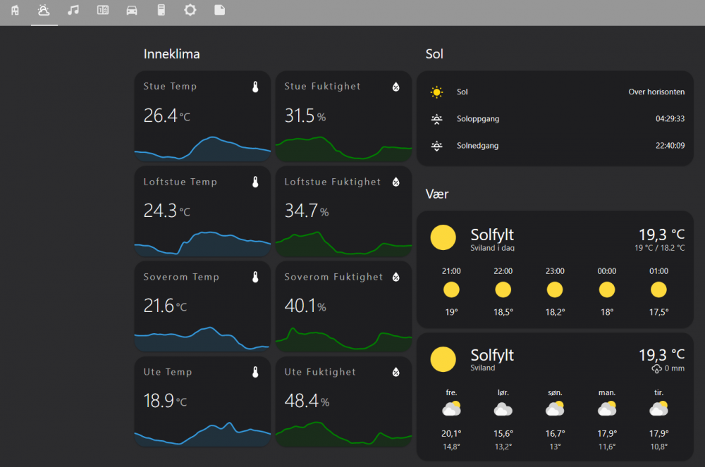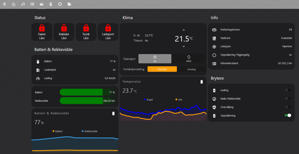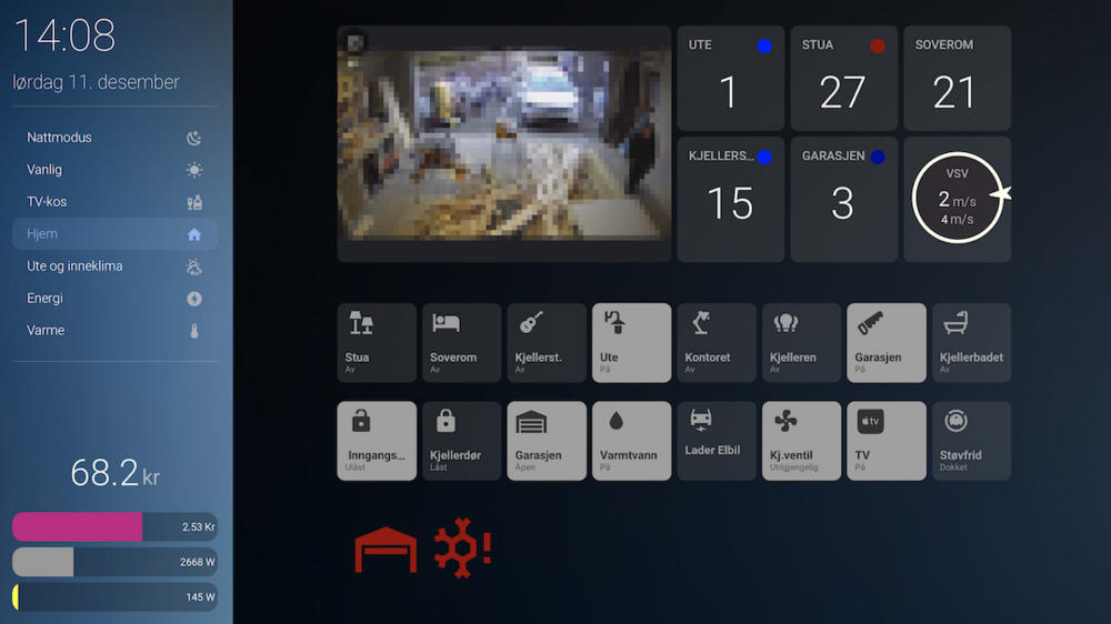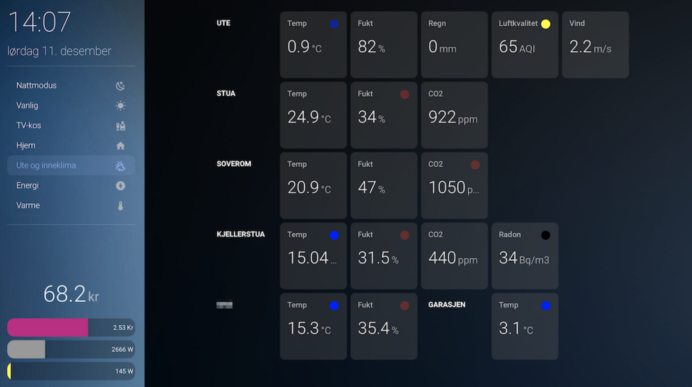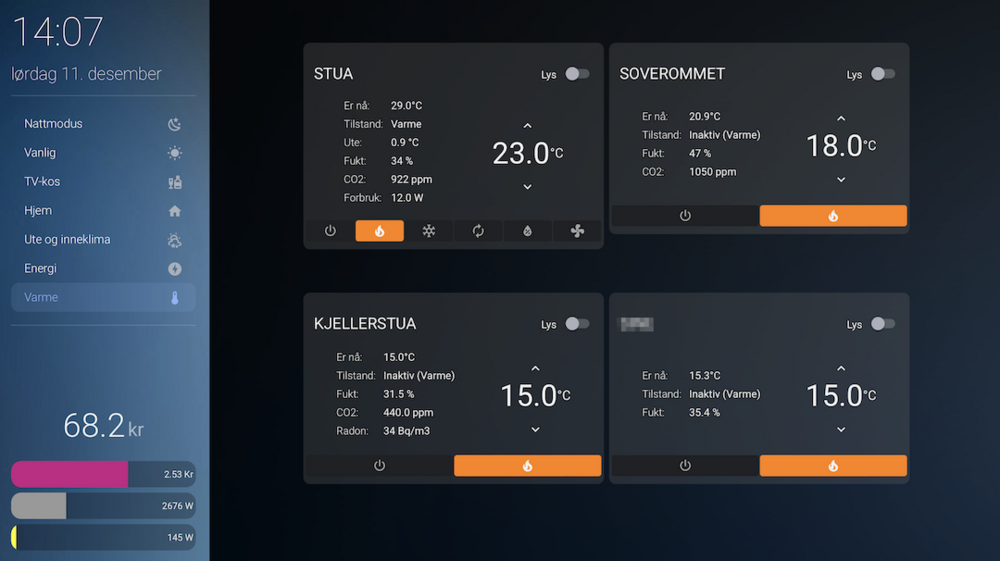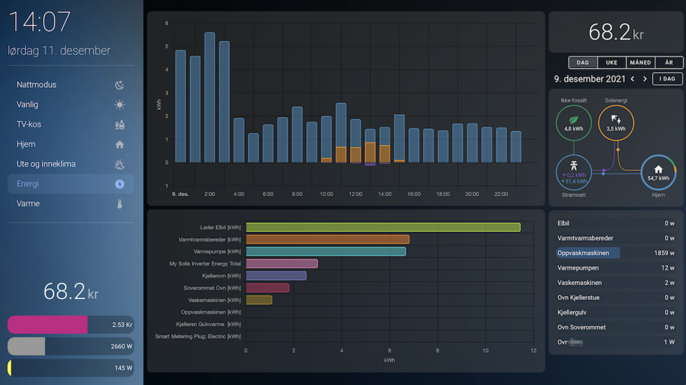 Etter alvorlig lang tid med unødvendig mye rot og stress på hjemskjermen, har jeg ryddet bort masse entiteter og knapper for å opprettholde en viss WAF. Nå er jeg og kona endelig fornøyd med oppsettet. Vi har ett separat oppsett for skjerm og mobil. Hvis interesse, kan jeg poste mobilversjonen. Dataene nede i venstre hjørne er strømpris inkl. avgifter og nettleie, forbruk nå (går til salg når solcellene gir plussverdi) og solcellenes effekt nå. 68,2 er strømkostnad til nå i dag.1 poeng