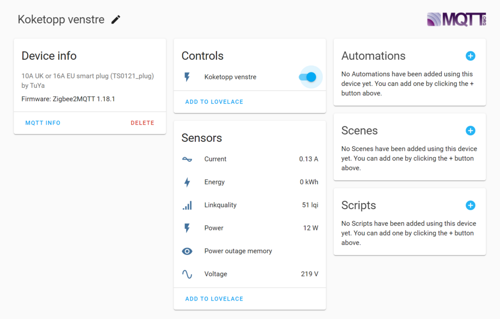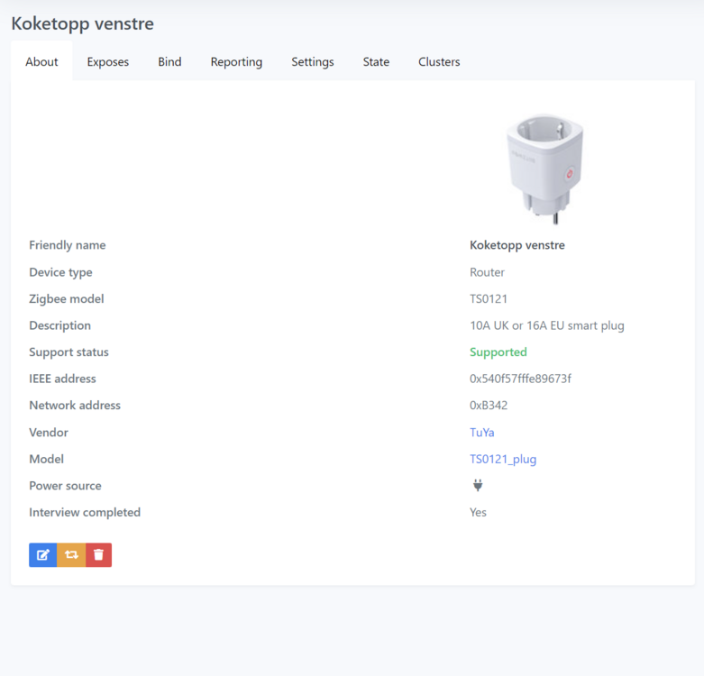 Da har jeg testet den med cc2652p sammen med zigbee2mqtt. Det er jo TuYa komponent så den spratt rett opp. Har ikke Deconz satt opp i dette systemet (bare test riggen), men tipper den dukker opp der også. Kan kontrollere den via Home Assistant, ser forbruket på den ene kontakten, eneste jeg ikke har klart å sette er default-start posisjon (on / off / restore). Får en feilmelding når kommandoen sendes. Det er heldigvis bare å trykke på den lille knappen for å slå kontakten av/på hvis strømmen går. Kontakten bygger litt mer enn en standard Elko Plus kontakt, men om Elko'n skal gjøres smart må det inn en styrepille av noe slag uansett. Er veldig positiv til utseendet, ikke mye forskjell i design fra Elko Plus, og om du har disse vil du ikke se forskjell uten at du går veldig nært (og da skal du i tillegg være flink på detaljer 😉 ) Løp og kjøp (har akkurat bestilt meg 5 til).1 poeng