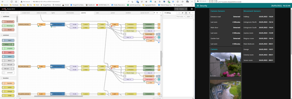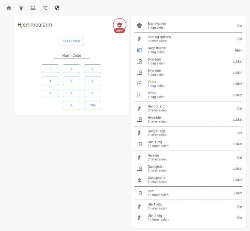 Da tenkte jeg å presentere alarmsystemet mitt. Det er sikkert noen som kan hente ut litt tips eller inspirasjon ut av det. Mitt mål var at det skulle gjøre minst mulig ut av seg. Verken jeg eller kona kommer til å gidde med å slå av og på alarm med kodetasting. Og der er jeg vel nå, synes jeg. Har ikke hatt behov for å trykke inn kode på månedsvis. I tillegg til avslått har systemet 3 tilstander - armert hjemme, natt og borte. Armert natt er enkel. Den tilstanden blir slått på og av kun basert på en status på om det er sovetid eller ikke. Armert hjemme blir slått av og på basert på bevegelsesensorer i gang foran utgangsdør og innvendig i garasje. Er vi i 2. etg og utgangsdør blir åpnet så går alarmen. Men går jeg ned en etasje og åpner døren selv så er alarmen avslått i det jeg blir sett av bevegelsesensoren. Armert borte blir aktivert så snart huset er tomt. Her bruker jeg tilstanden for om "noen er hjemme" som baserer seg på mer enn 10 forskjellige innganger. Alarmen blir avslått så snart jeg eller kona sin telefon kommer innenfor en gitt avstand til huset. Vanligvis er alarmen avslått 10s før garasjeporten åpnes. Hvis dør, vindu eller port åpnes uten at vi er i nærheten, så går alarmen etter 30s. Men det sendes en beskjed til telefonene om å oppdatere posisjonsstatus og hvis denne kommer og er innenfor en gitt avstand i løpet av 30s så blir alarm avslått. Og har en av oss glemt telefonen hjemme, så kan jeg sette en status på det også for å hindre alarmen i å bli avslått. Varsling er også forskjellig i de tre tilstandene. Ved armert borte blir det varslet kun på telefon, men det blir også tatt et bilde av inngangspartiet. Ved armert natt blir kun lyset på soverommet slått på. Og ved armert hjemme vil det blinke et kort blink i lyset i noen utvalgte rom. Ved brannalarm så vil jeg ikke sette i gang med støvsuging hvis noen studerer koden og stusser på den saken. Scene.stovsuge er fullt lys i hele huset og det er jo greit å ha ved brann også. Så da ble det til at det ble valgt. Systemet er det som er innebygd i Home Assistant og der jeg har lagd all automasjon rundt dette med Appdaemon. I alarm.py import appdaemon.plugins.hass.hassapi as hass class AlarmTrigger(hass.Hass): def initialize(self): for tr in self.args["triggers"]: self.listen_state(self.trig, tr, new = "on", old = "off") def trig(self, entity, attribute, old, new, kwargs): if self.get_state("alarm_control_panel.hjemmealarm") == self.args["state"]: self.call_service("variable/set_variable", variable = "alarm_trigger", value = self.get_state(entity, attribute="friendly_name")) self.call_service("alarm_control_panel/alarm_trigger", entity_id = "alarm_control_panel.hjemmealarm") self.call_service("notify/mobile_app_sm_g955f", message = "request_location_update") self.call_service("notify/mobile_app_sm_g930f", message = "request_location_update") self.log('Alarm utløst') class Arm(hass.Hass): def initialize(self): self.listen_state(self.armhome, "binary_sensor.gang_1_etg_presence", new = "off", old = "on", duration = 300) self.listen_state(self.armhome, "binary_sensor.gang_u_etg_presence", new = "off", old = "on", duration = 300) self.listen_state(self.armhome, "binary_sensor.garasje_presence", new = "off", old = "on", duration = 300) self.listen_state(self.disarmhome, "binary_sensor.gang_1_etg_presence", new = "on", old = "off") self.listen_state(self.disarmhome, "binary_sensor.gang_u_etg_presence", new = "on", old = "off") self.listen_state(self.disarmhome, "binary_sensor.garasje_presence", new = "on", old = "off") self.listen_state(self.armnight, "input_boolean.sleeptime", new = "on", old = "off") self.listen_state(self.disarmnight, "input_boolean.sleeptime", new = "off", old = "on") self.listen_state(self.armaway, "binary_sensor.noen_er_hjemme", new = "off") self.listen_state(self.disarmaway, "person.__________", new = "home") self.listen_state(self.disarmaway, "person.__________", new = "home") def armhome(self, entity, attribute, old, new, kwargs): if ( self.get_state("alarm_control_panel.hjemmealarm") == "disarmed" and self.get_state("binary_sensor.gang_1_etg_presence") == "off" and self.get_state("binary_sensor.gang_u_etg_presence") == "off" and self.get_state("binary_sensor.garasje_presence") == "off" ): self.call_service("alarm_control_panel/alarm_arm_home", entity_id = "alarm_control_panel.hjemmealarm", code = "xxxx") def disarmhome(self, entity, attribute, old, new, kwargs): if self.get_state("alarm_control_panel.hjemmealarm") == "armed_home": self.call_service("alarm_control_panel/alarm_disarm", entity_id = "alarm_control_panel.hjemmealarm", code = "xxxx") def armnight(self, entity, attribute, old, new, kwargs): self.call_service("alarm_control_panel/alarm_arm_night", entity_id = "alarm_control_panel.hjemmealarm", code = "xxxx") def disarmnight(self, entity, attribute, old, new, kwargs): self.call_service("alarm_control_panel/alarm_disarm", entity_id = "alarm_control_panel.hjemmealarm", code = "xxxx") def armaway(self, entity, attribute, old, new, kwargs): self.call_service("alarm_control_panel/alarm_arm_away", entity_id = "alarm_control_panel.hjemmealarm", code = "xxxx") def disarmaway(self, entity, attribute, old, new, kwargs): if ((self.get_state("alarm_control_panel.hjemmealarm") == "pending" or self.get_state("alarm_control_panel.hjemmealarm") == "armed_away") and self.get_state("input_select.phone_status") == "Auto"): self.call_service("alarm_control_panel/alarm_disarm", entity_id = "alarm_control_panel.hjemmealarm", code = "xxxx") self.log('Slo av alarm automatisk') class NotifyCommon(hass.Hass): def initialize(self): self.listen_state(self.notify, "alarm_control_panel.hjemmealarm", new = "triggered") def notify(self, entity, attribute, old, new, kwargs): self.call_service("script/send_melding", title = "Alarm {}".format(self.get_state("sensor.time")), message = "Alarm er utløst av {}".format(self.get_state("variable.alarm_trigger"))) self.call_se
