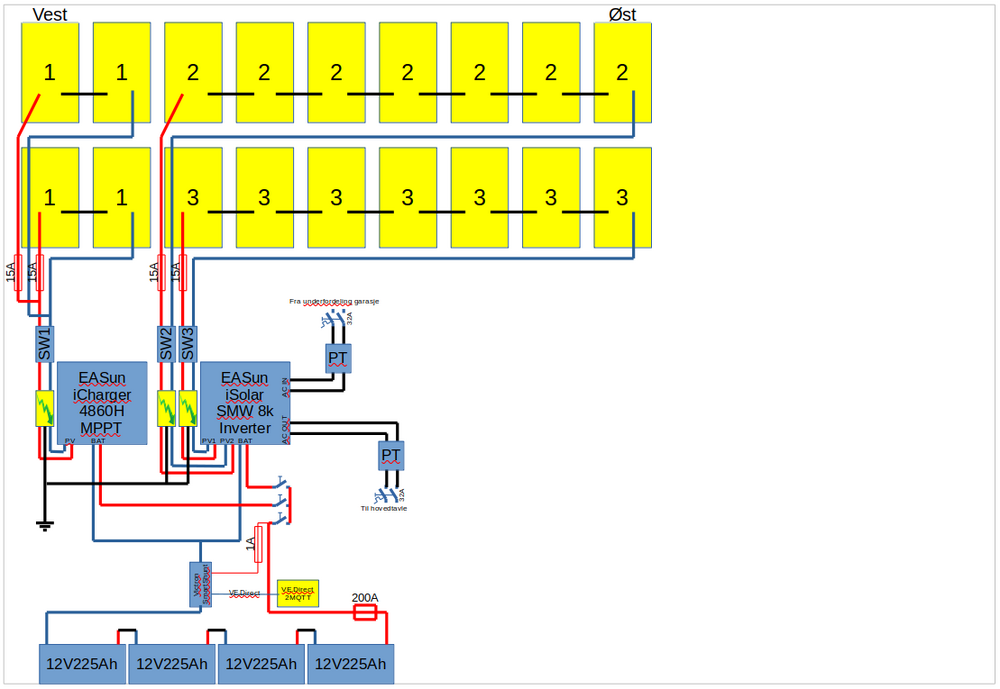 Festemateriell for solsellepanel ble lovet forrige uke men ikke dukket opp hos leverandøren enda... Batteribanken er på plass og koblet, Victron SmartShunt 500 på plass og ESP32 med VE.Direct2MQTT koblet opp og prøvekjørt, MPPT laderen henger på veggen, inverteren har i alle fall passert norsk toll, litt småknask på vei fra Kina, det begynner å nærme seg noe... Skisse over opplegget ser for tiden slik ut men der blir kanskje noen endringer etterhvert...1 poeng