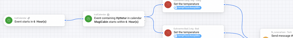 Jeg kom over en kul app som gjorde automasjonen enda mer dynamisk. Kan være flere som er klar over denne, men sikkert et par som ikke har tenkt over det Som mange andre, har vi hytte og eller på ferie nå og da. De fleste av oss har sikkert lagd automasjoner som fikser dette allerede, men ved å integrere dette med en app som automatisk leser data fra en del ics/ical - kalender, så blir det enda mer fleksibelt og dynamisk. Appen "IcalCalendar", gjør at din Homey får flytkort som kan utløses direkte basert på det du har av kalenderavtaler i en gitt kalender. Eksempel på bruk; Du legger inn at du skal på hytta fra torsdag til mandag i din kalender som du har valgt å eksponere på internett som ics/ical-kalender. Typisk har jeg lagd en egen kalender for dette, og ikke min "personlige". Deretter er det bare å konfigurere appen i Homey, for hvilken syntax den skal lete i, i hvilken ics (uri/url), og lage den automatikken du ønsker med flows. Og, det gjelder ikke bare når eventet ditt starter, men også når den feks slutter, endres eller hva det nå skulle være. Fantastisk app! Enkelt eksempel;1 poeng