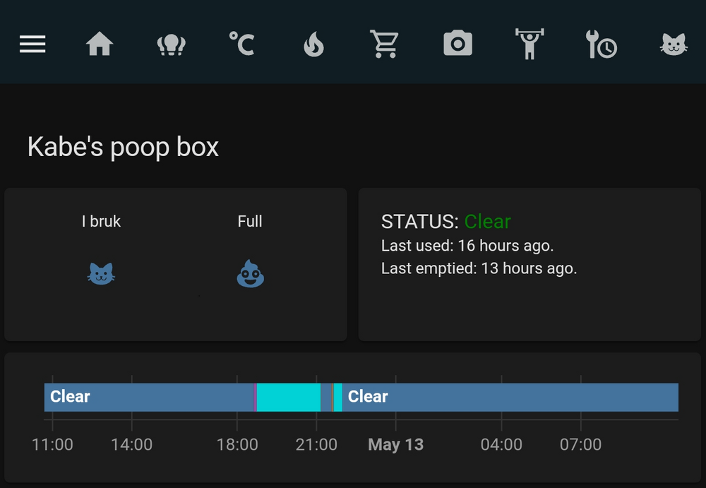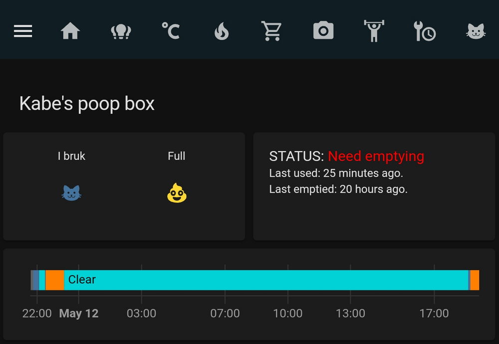 Istedenfor en kjedelig stolpe som viser pådrag i fra 0-100% på effektbegrensingen så har jeg erstattet denne med en rekke med ikoner som viser status. Grått hvis de ikke bruker strøm og rødt hvis de drar strøm. Da blir det lettere å se hva som er slått av for at jeg skal klare å holde meg under enten 5 eller 10kWt/t PS. Jeg har ikke slått av eller på toalettet, men varmekablene i det rommet toalettet står. I tilfelle noen ville pirke på det......1 poeng