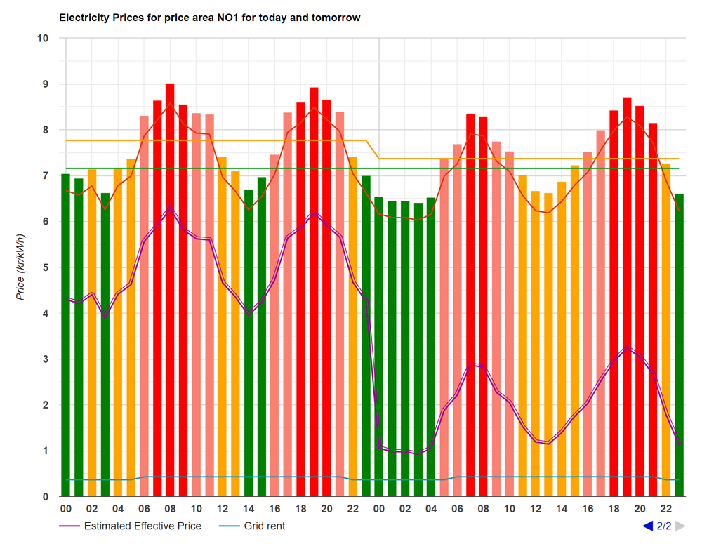 Den tiden vi går inn i nå med 90% "strømstøtte" vil det være viktigere enn noengang å flytte forbruk til billige timer. Figuren viser strømprisene for NO1 for i dag og i morgen time for time. Lilla linje viser prisene etter at strømstøtten er trukket fra. For i morgen er laveste pris under 1kr, mens høyeste pris er nesten 3kr. Om en klarer å flytte forbruk til de rimeligste timene er det selvfølgelig mye å spare. Husk at lilla kurve er fasit for i dag, men kun et estimat så lenge måneden ikke er slutt, så den kan flytter opp / ned avhengig av gjennomsnittelig spotpris.1 poeng
